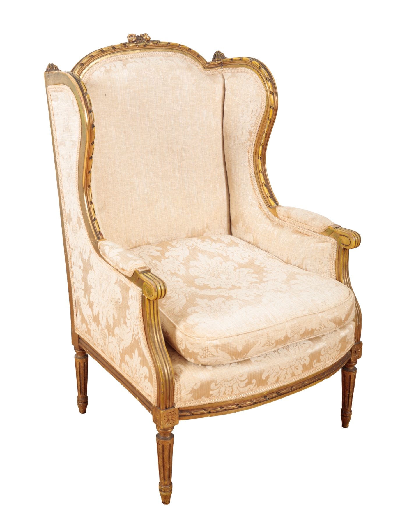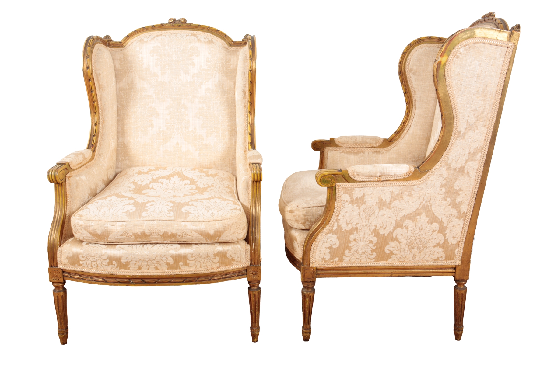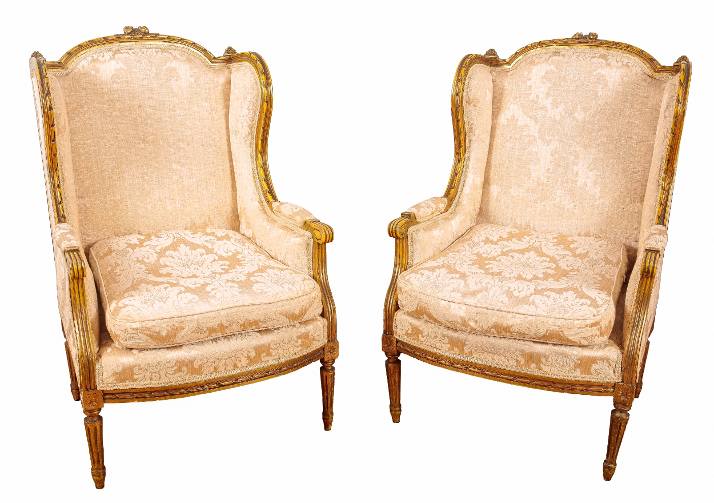 the wingbacks with moulded cresting rails and scroll arms, the stuffed back and seats with damask covers, on fluted and tapered legs, 103cm high x 68cm wide (2)