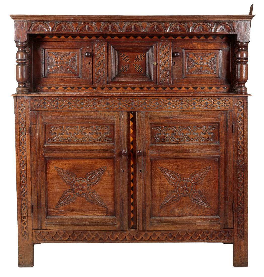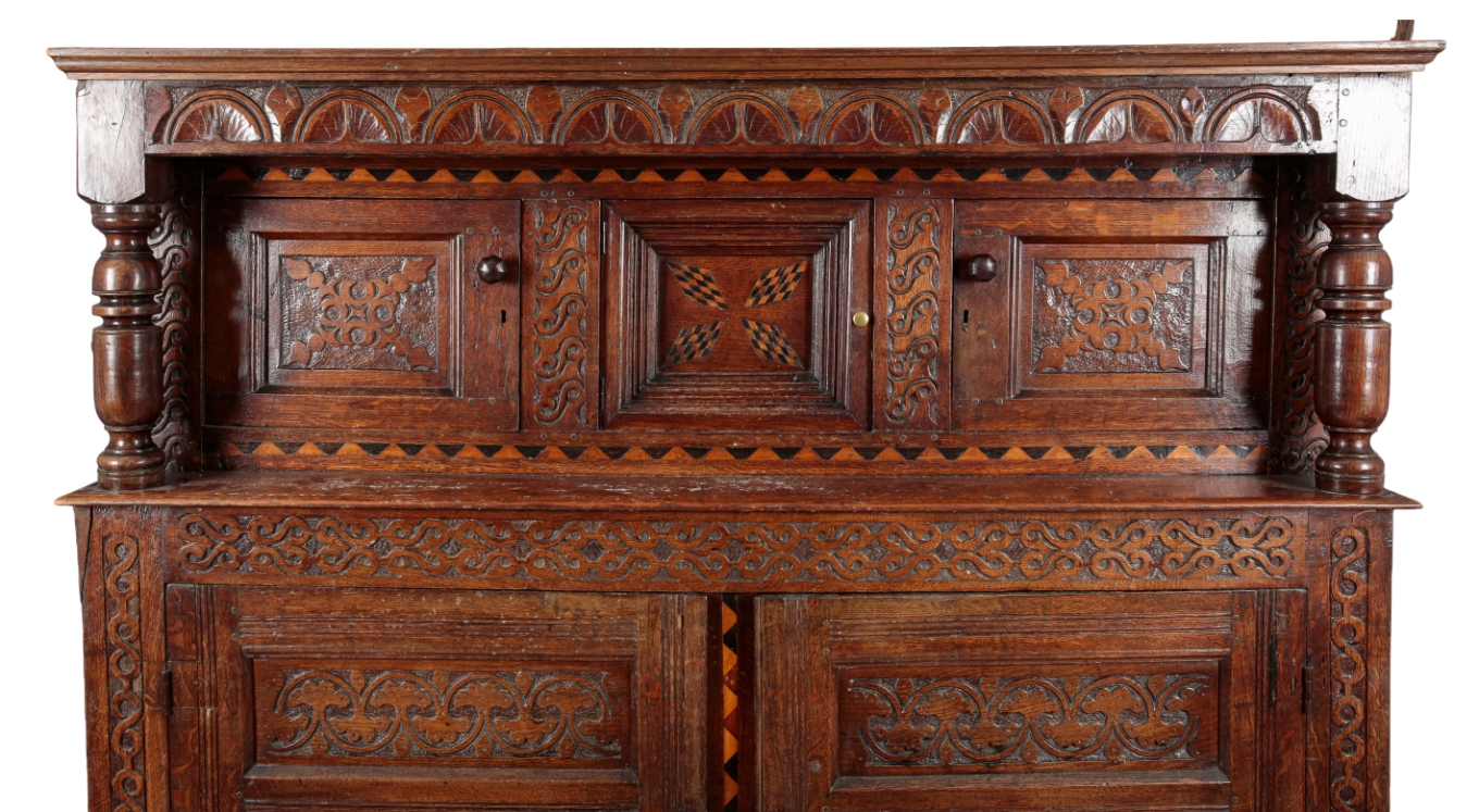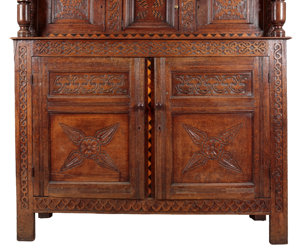 There are a number of small alterations and later additions including handles and escutcheons. Otherwise it appears to be in good overall condition, with solid structure and clean appearance. Some areas of surface wear, scratching and marks consistent with age and use. One piece of moulding is damaged but present to the right side of the cornice. Some splits evident. Small evidence of old worm.