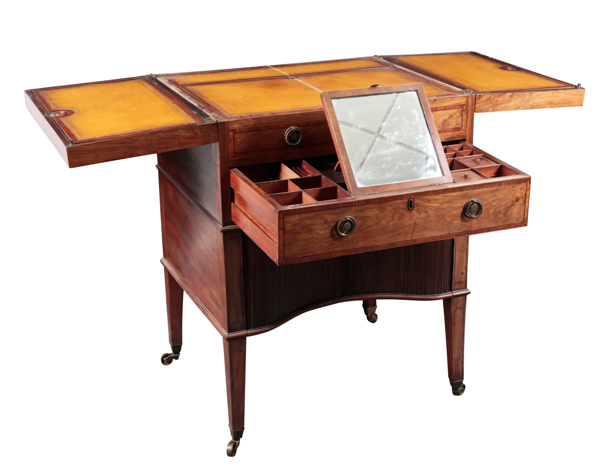 the crossbanded top opening outwards to reveal a gilt tooled leather lined writing surface and a concealed gallery fitted with small drawers and pigeon holes that appears when a button is pressed, a single frieze drawer opens to a lifting mirror and further small boxes and compartments, a tambor fronted recess beneath, on tapered square legs terminating in brass castors, 90cm high x 66cm wide x 56cm deep
