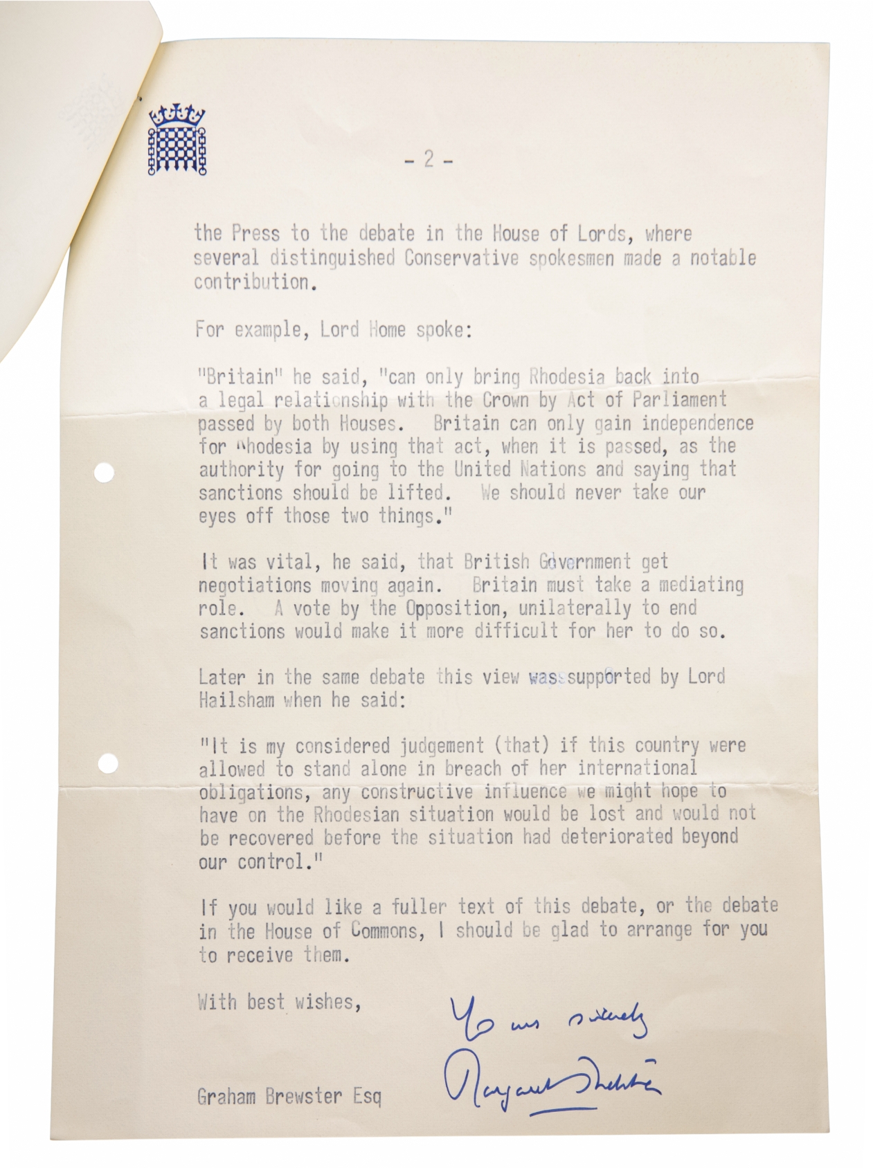 MARGARET THATCHER: A SIGNED TWO PAGE TYPED LETTER