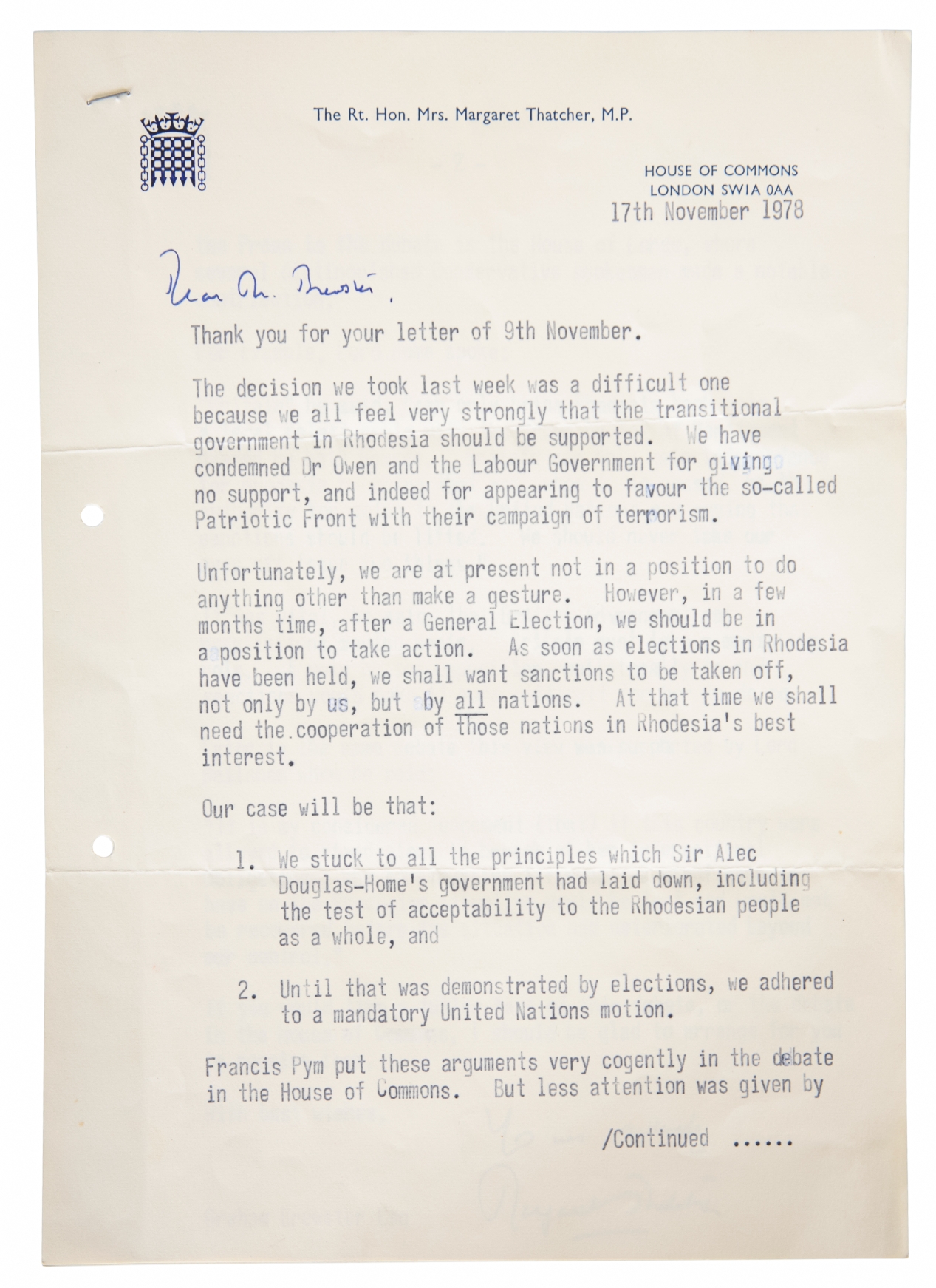 addressed to Graham Brewster on House of Commons headed paper, dated 17th November 1978, discussing the British Government’s support for the Rhodesian transitional government