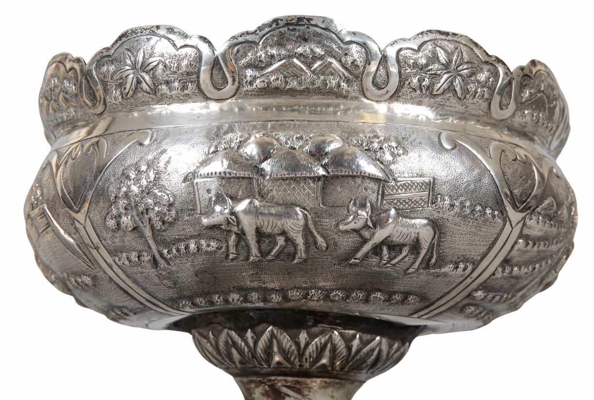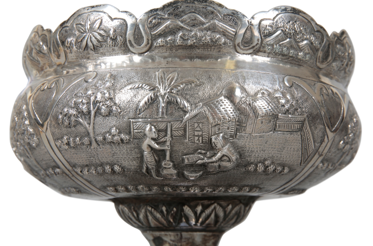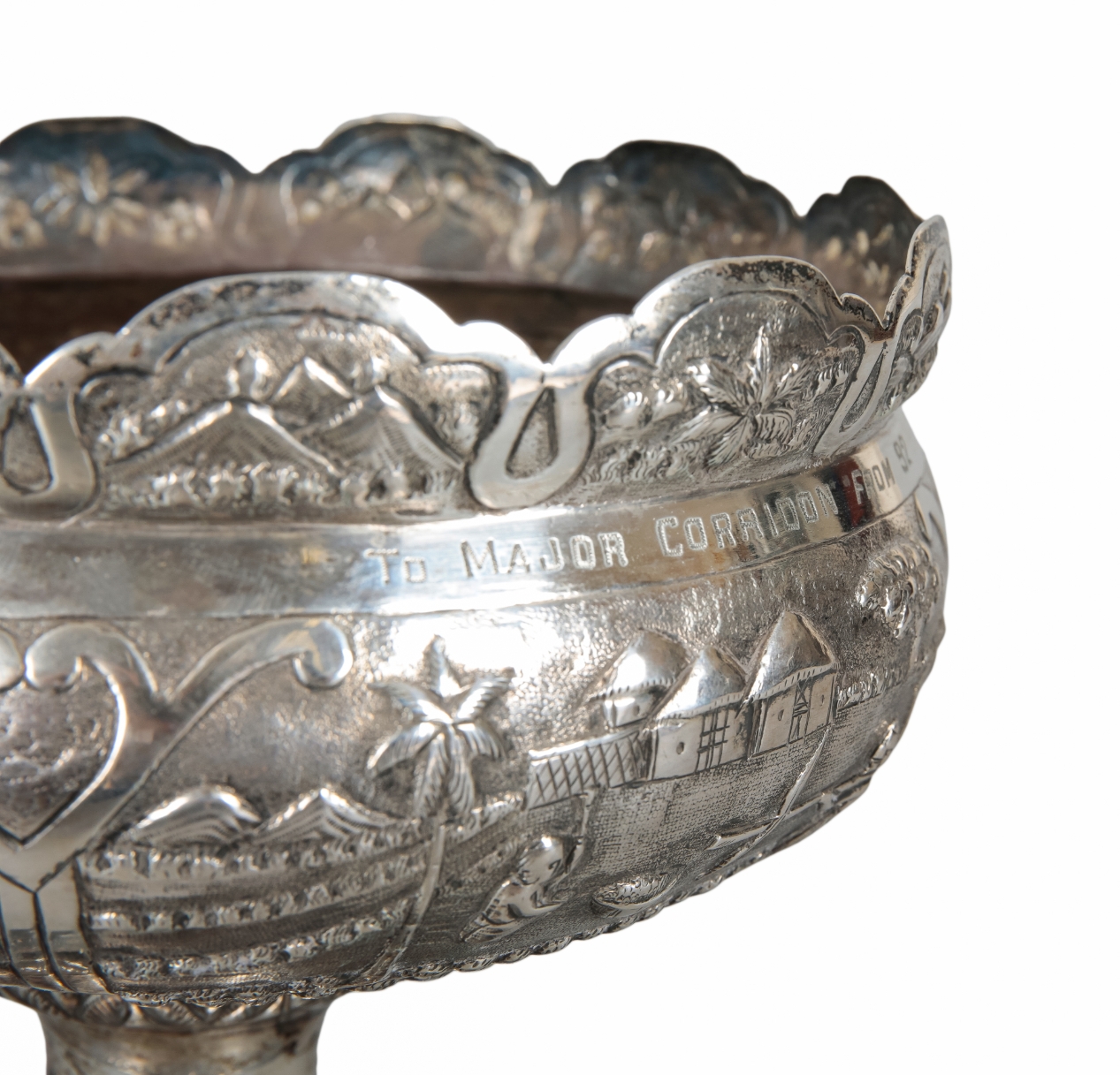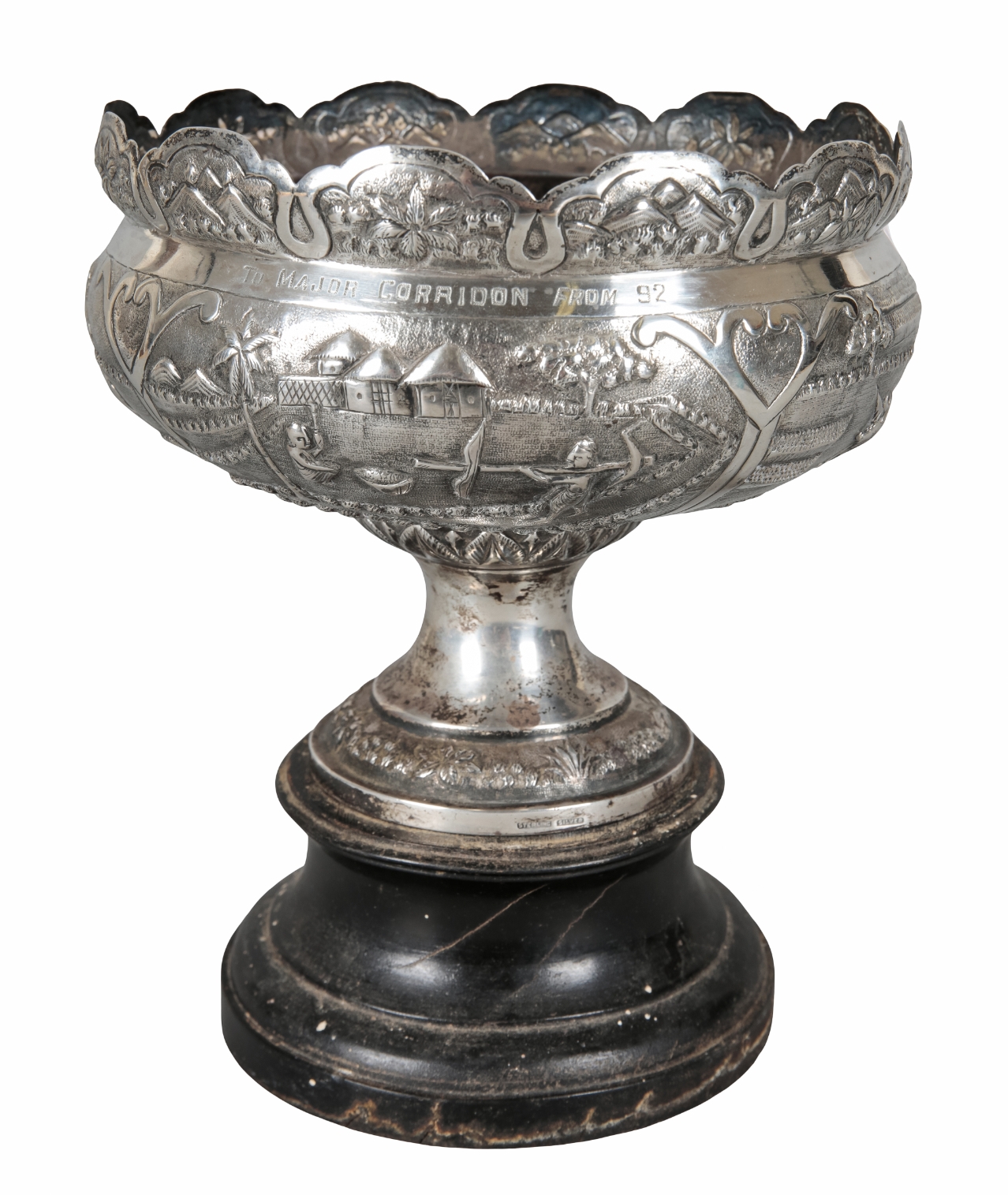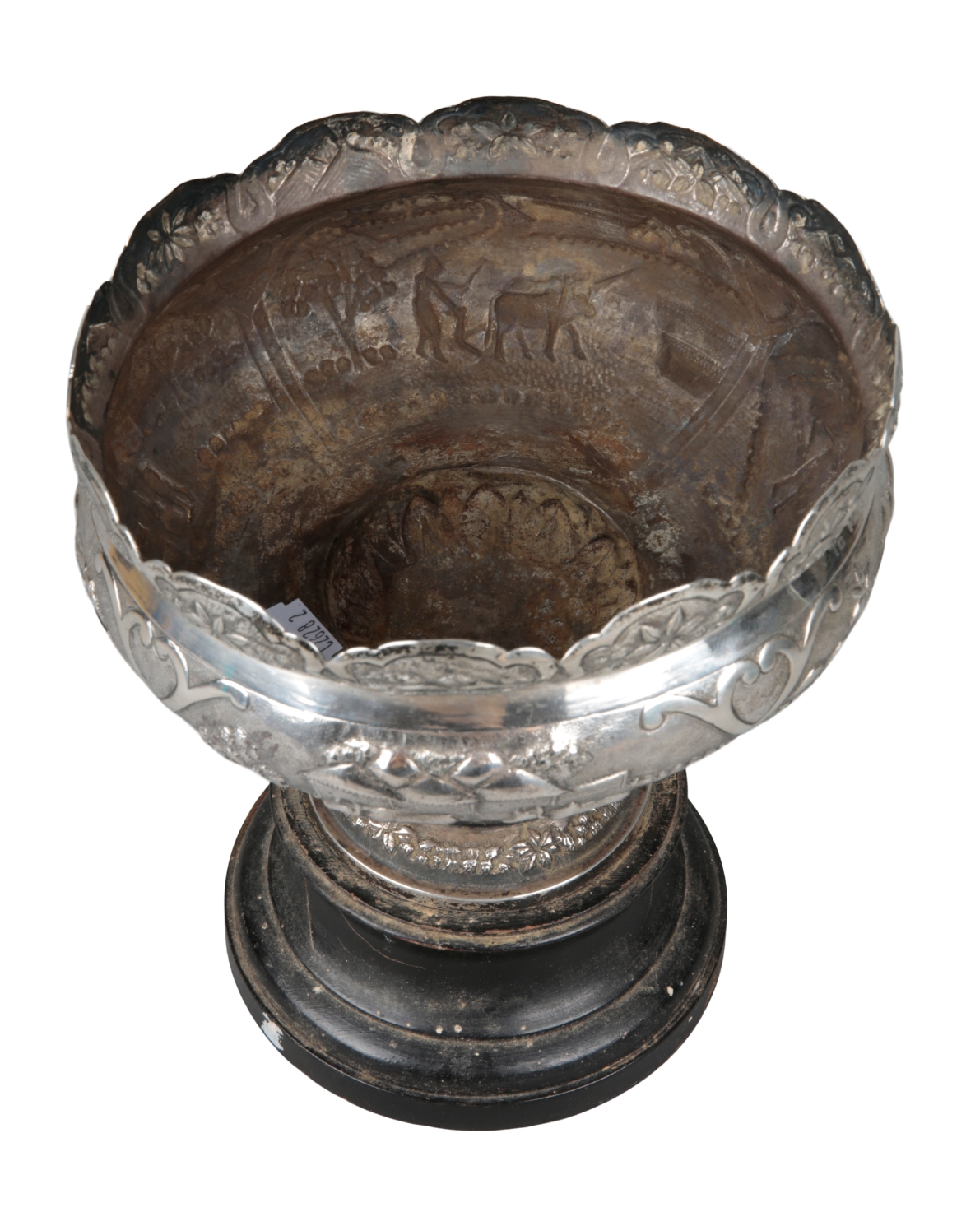 stamped Sterling Silver, decorated in relief with four pastoral vignettes of villagers, huts and farming, engraved to rim ‘To Major Corridon From ‘92’, 14.5cm high x 19.5cm diameter, 14 tr. ozs, on a turned ebony stand, 22cm high overall