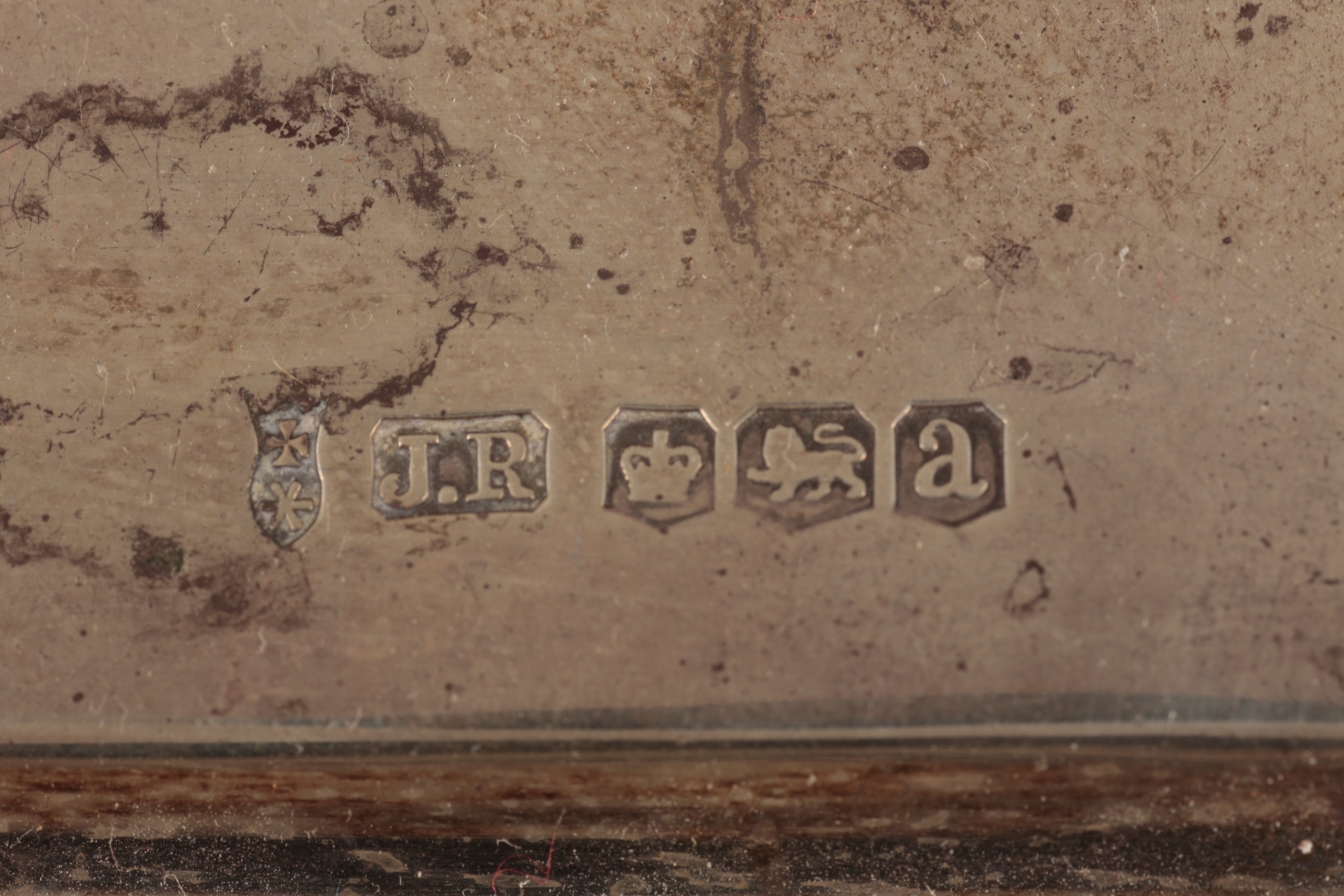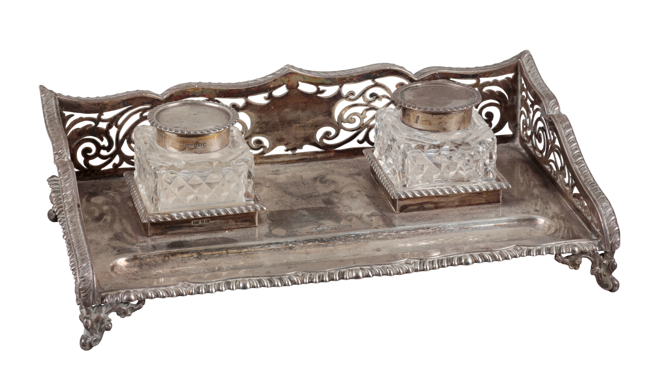 by Joseph Rodgers, Sheffield 1918, the shaped and fretted sides with gadroon mounts, scrolled feet, 25.5cm wide, 23 tr. ozs, with two silver topped glass inkwells