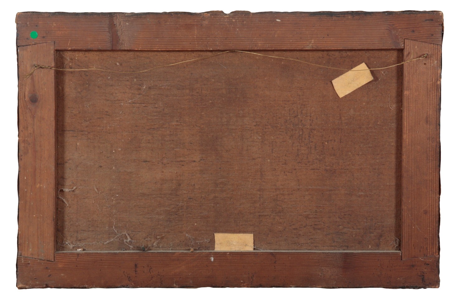 The painting bears some issues. It is unframed. The picture surface is generally stable, but there is very prominent craquelure throughout, as well as a prominent horizontal crack towards the top of the picture surface, where the stretcher shows through. There is an additional prominent, vertical line towards the right quadrant. There is a hole and accompanying area of restoration towards the upper left of the picture surface, with an accompanying section of tape to the reverse of the canvas. UV light examination reveals potential in-painting towards the lower centre of the picture surface. The painting would benefit from restoration. Please see additional images available on request.