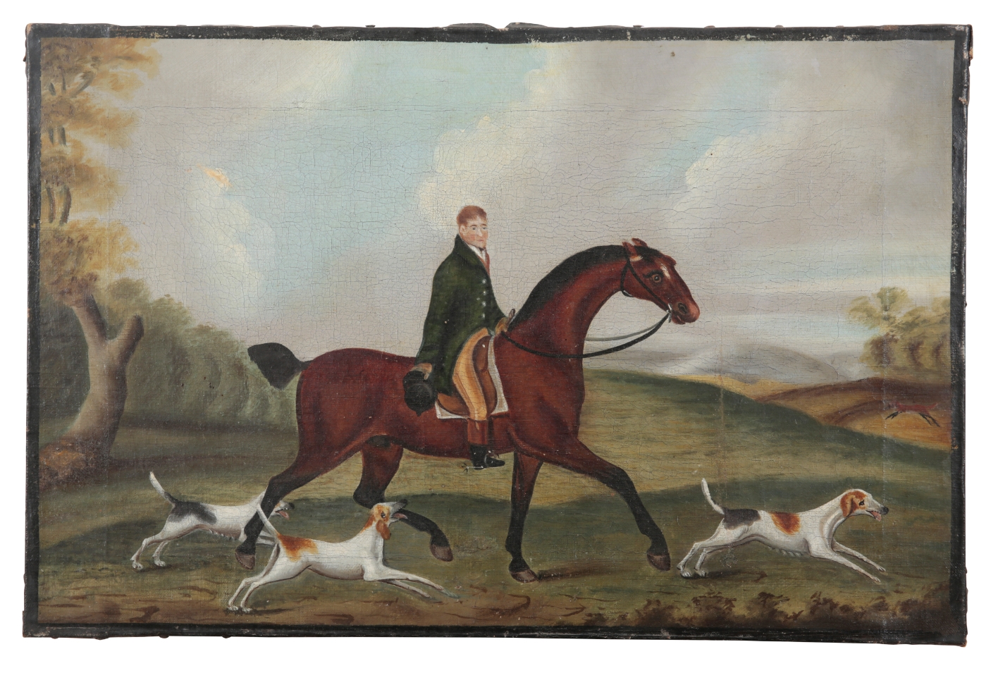 depicted with hounds at his feet and a fox in the distance, oil on canvas, 37cm x 57cm