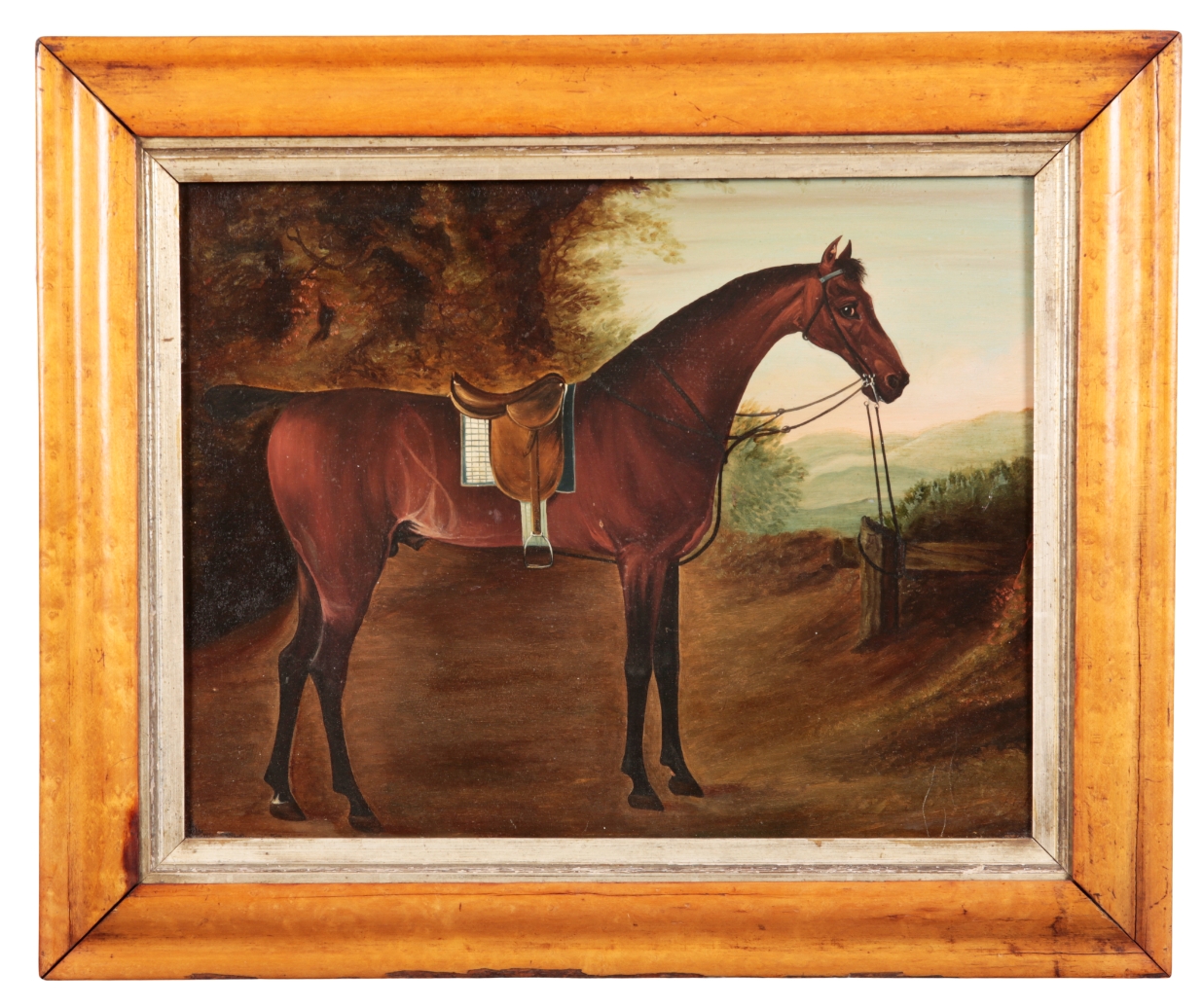 The painting is in acceptable, original condition, but bears a few issues. The picture surface is stable and bears a glossy varnish layer. There are numerous small abrasions and areas of loss scattered across the picture surface. There are some fairly prominent scratches towards the lower right quadrant of the picture surface. The grain of the wood support shows through in places. There is extensive wear to the frame, including areas of loss. Please see additional images available on request.