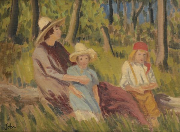 depicting three of the artist's sons, Caspar, Pyramus and Romily, in a woodland landscape, signed lower left, oil on board, 30cm x 40.5cm