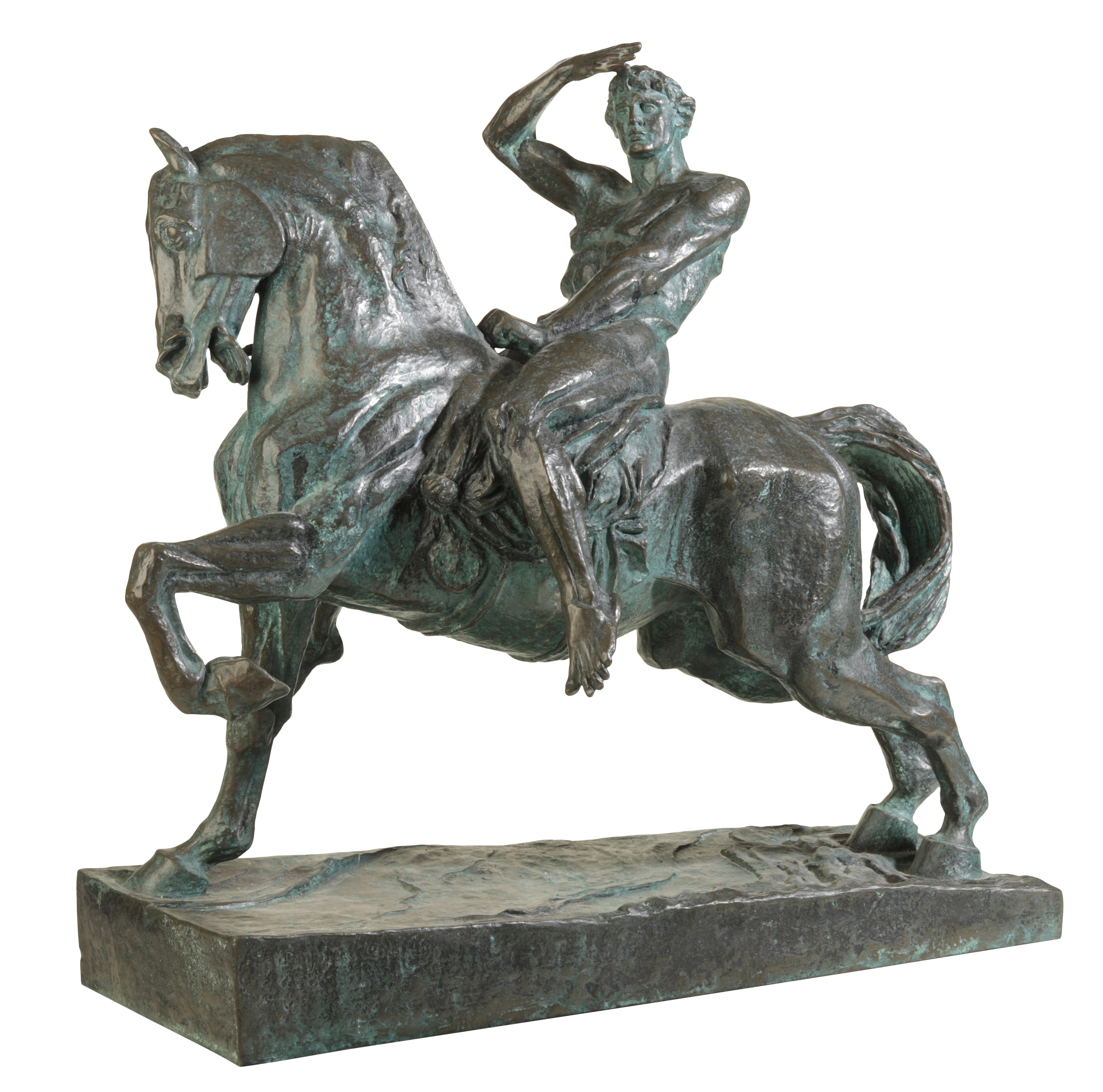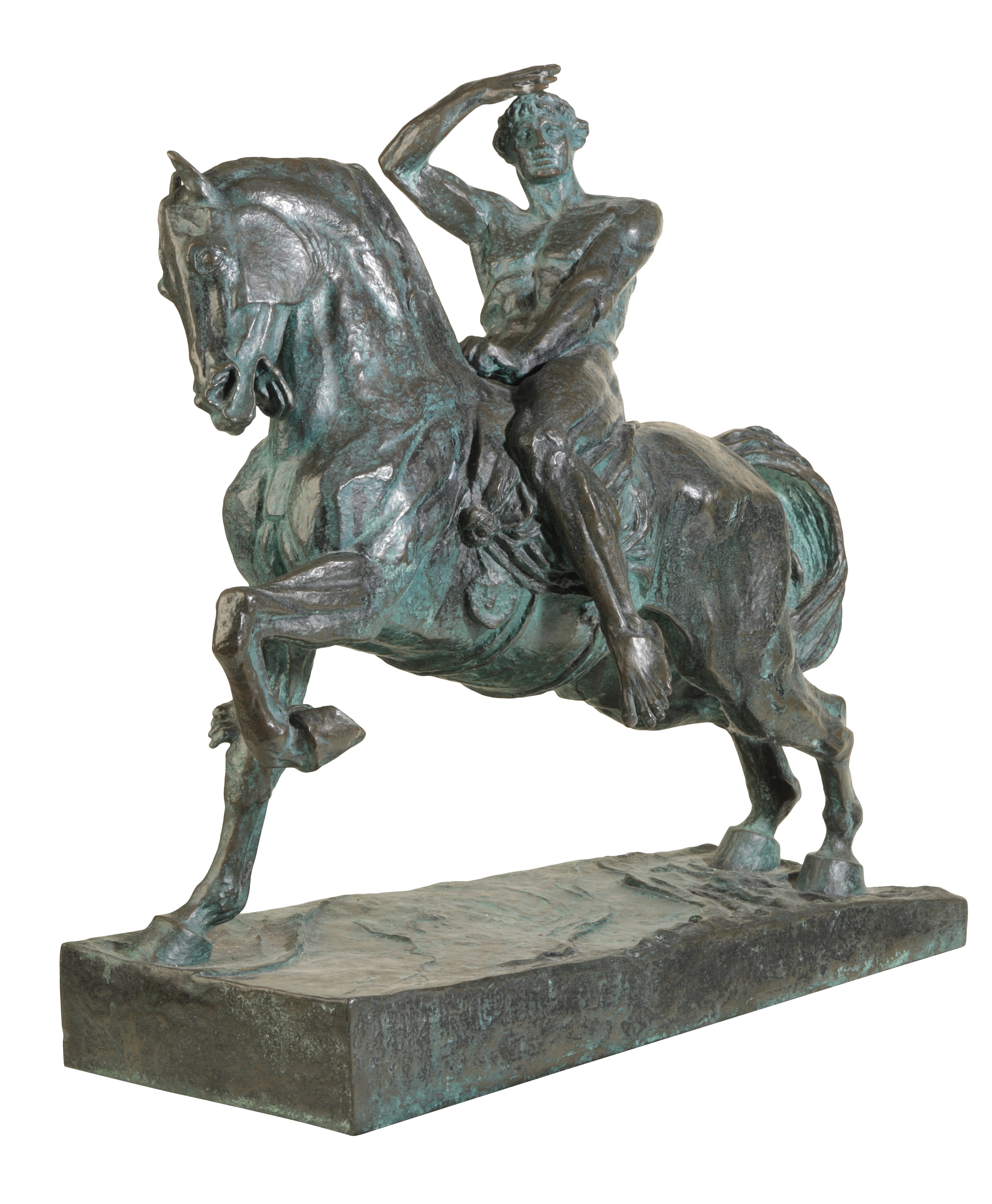 formed as a stylised classical male rider on his rearing steed, on rectangular naturalistic wedge-shaped base with cast inscription “Physical Energy, G.F. Watts”, 48cm wide x 47cm high