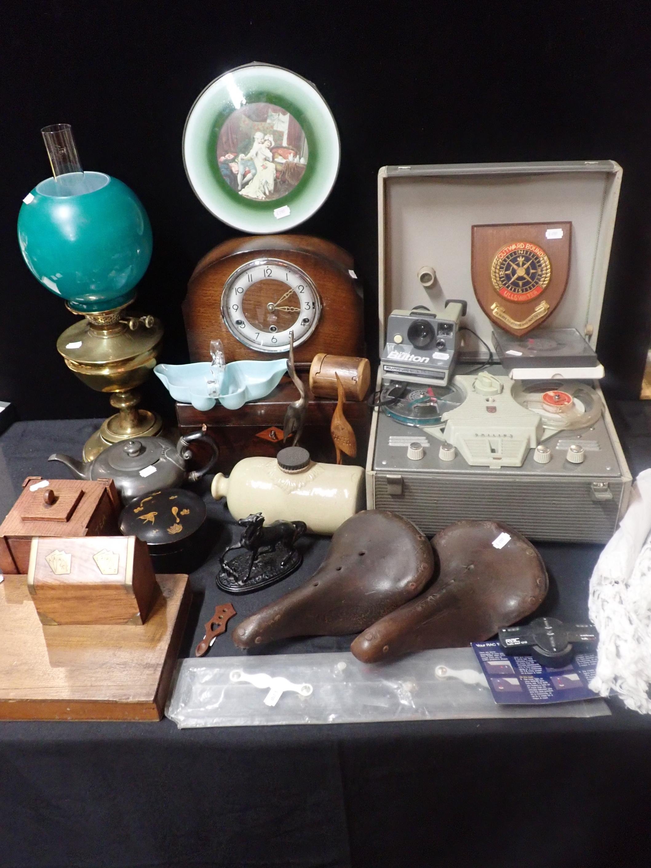 with Westminster chime, an oil lamp a Brooks cycle saddle, and other items