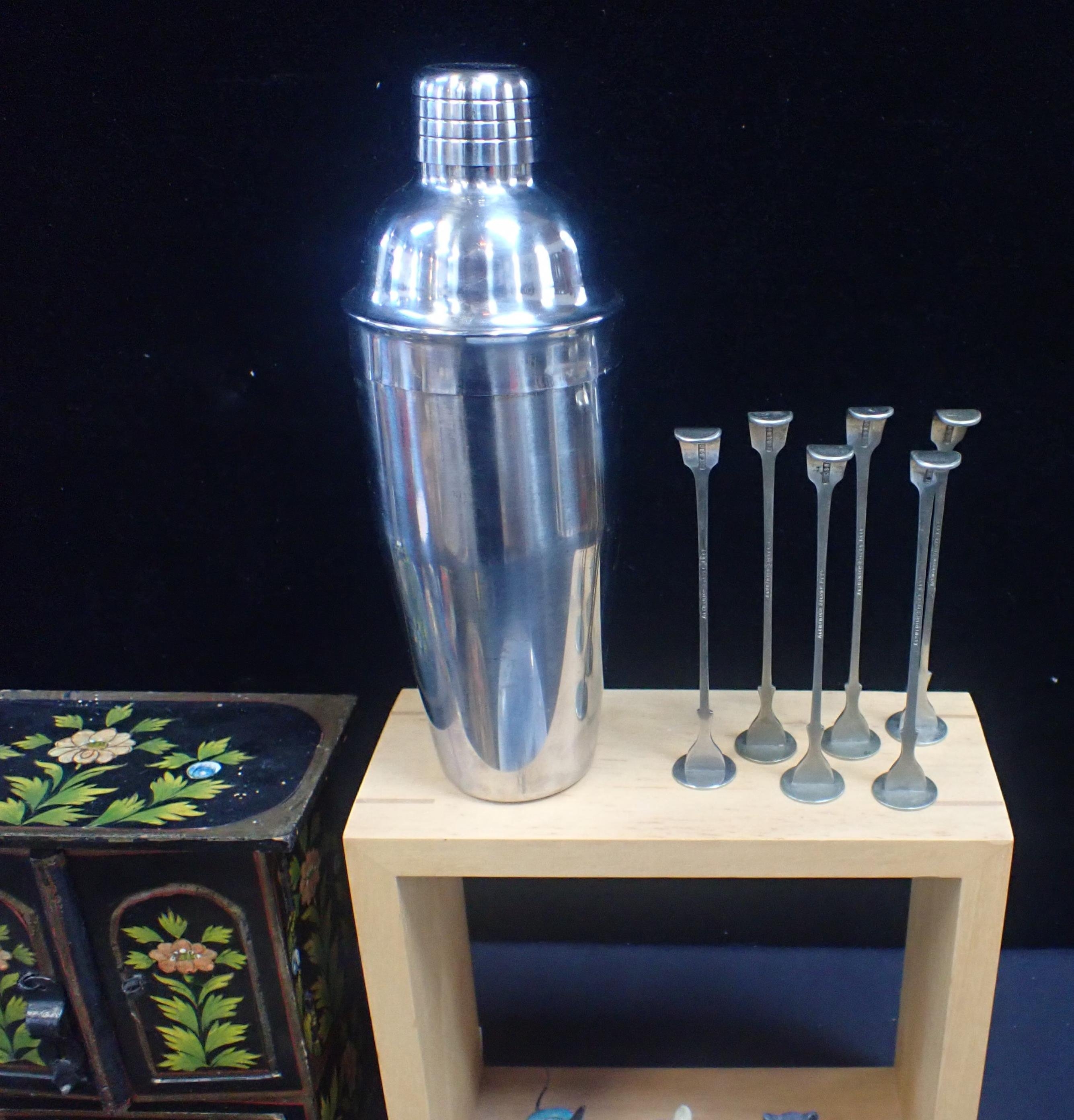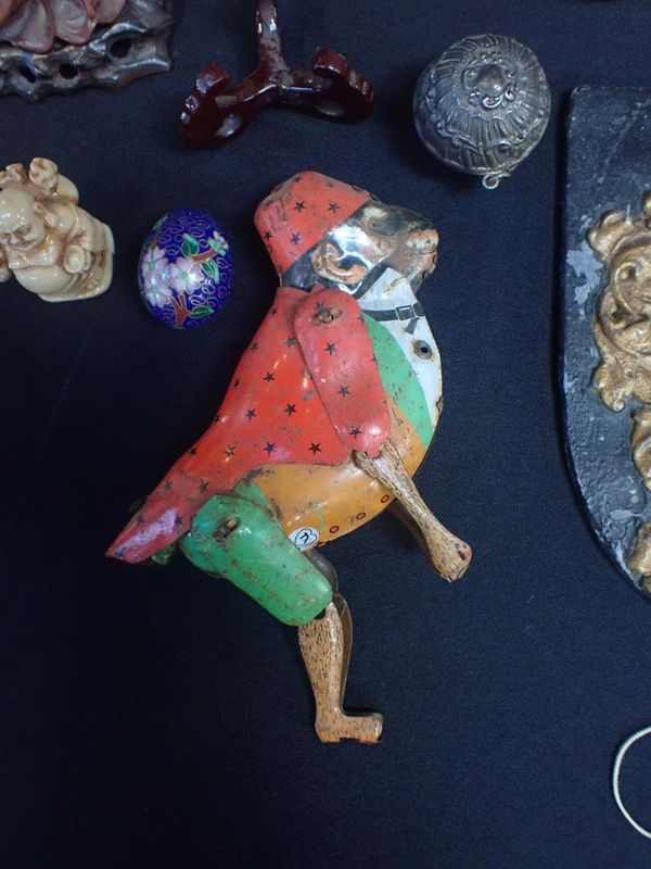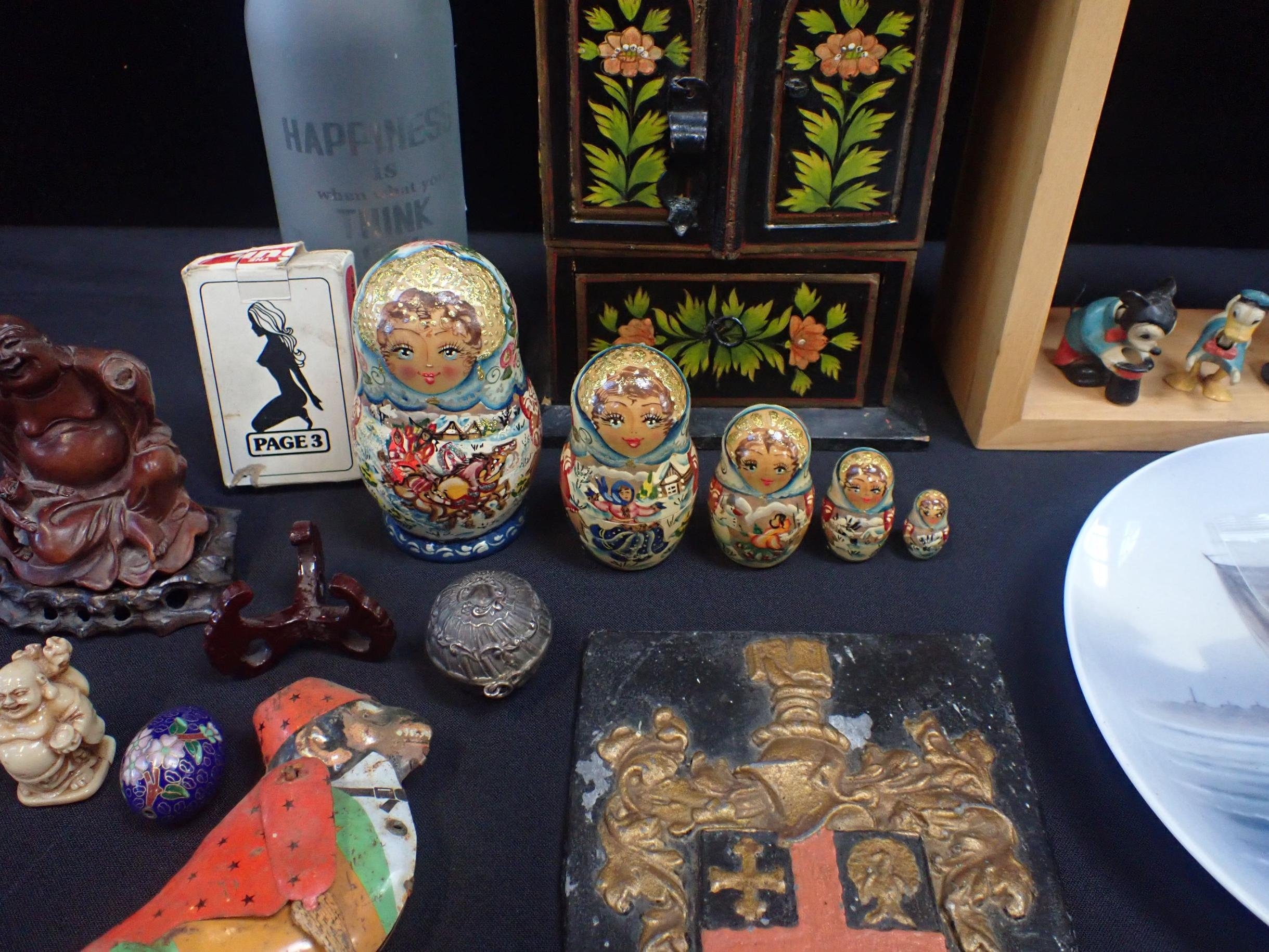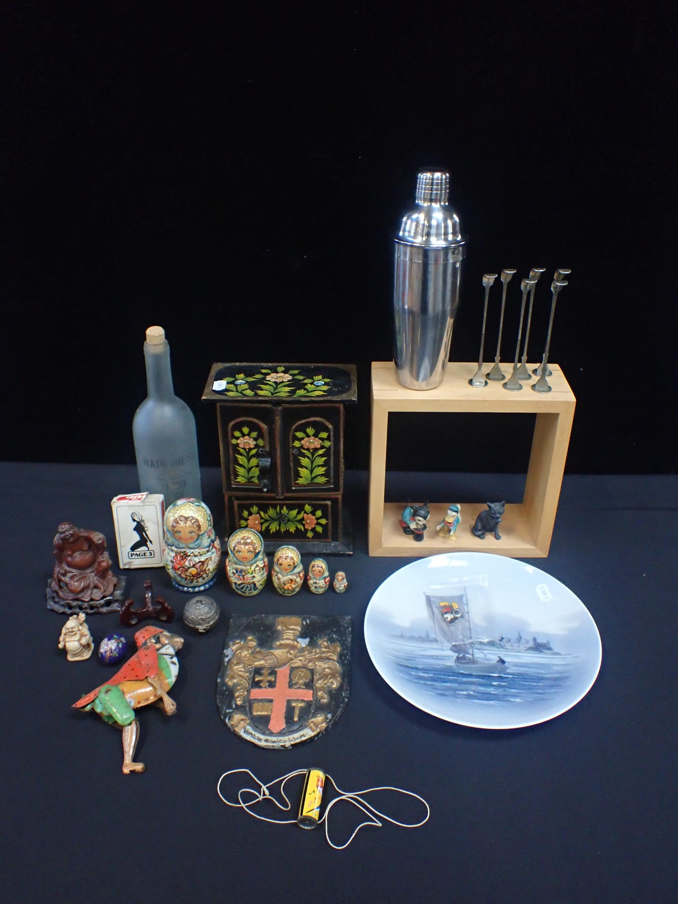including a Royal Copenhagen plate, a set of Russian dolls, cocktail shaker, and some vintage toys