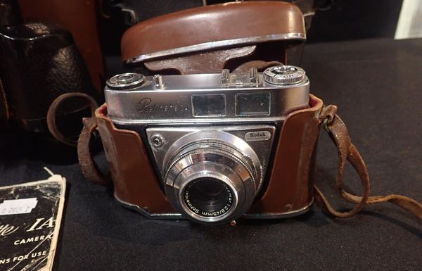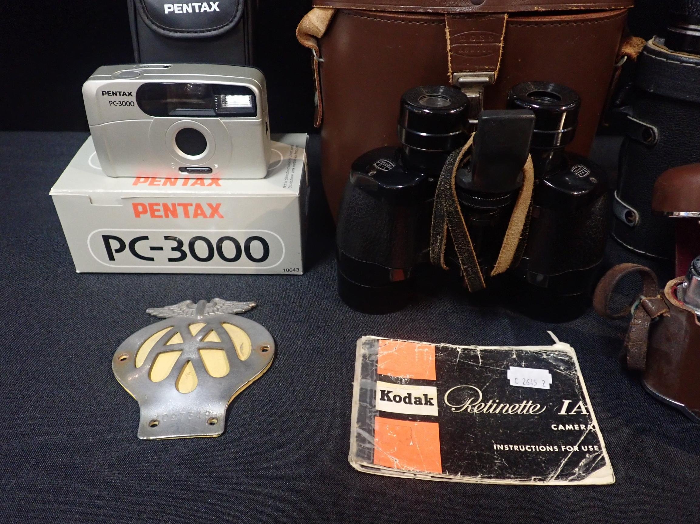 With an AA car badge, boxed 'Pentax pc-3000' camera and two pairs of binoculars. (5)