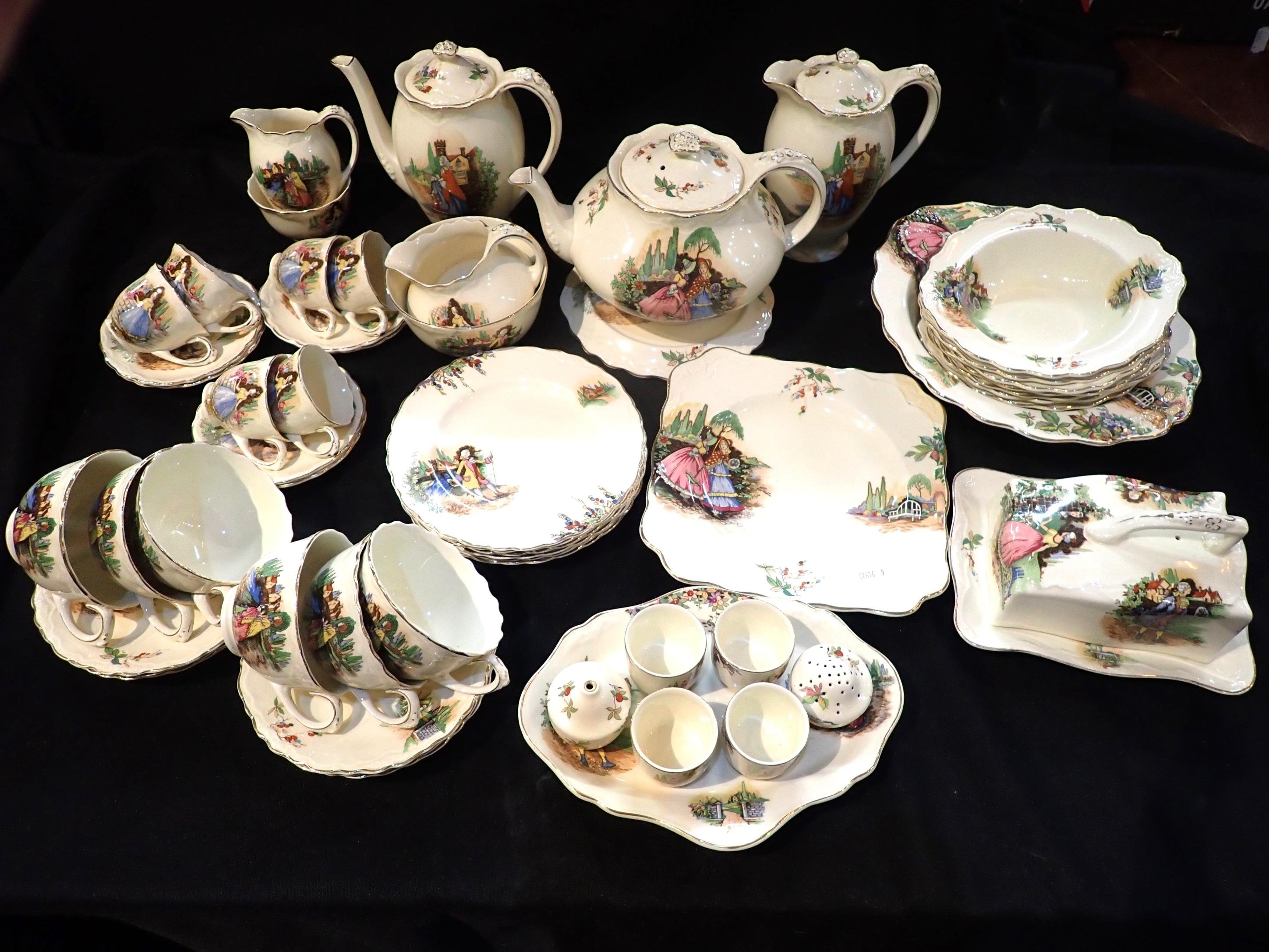 decorated with quaint early 19th scenes, with matching fruit dishes, egg cruet, and butter dish