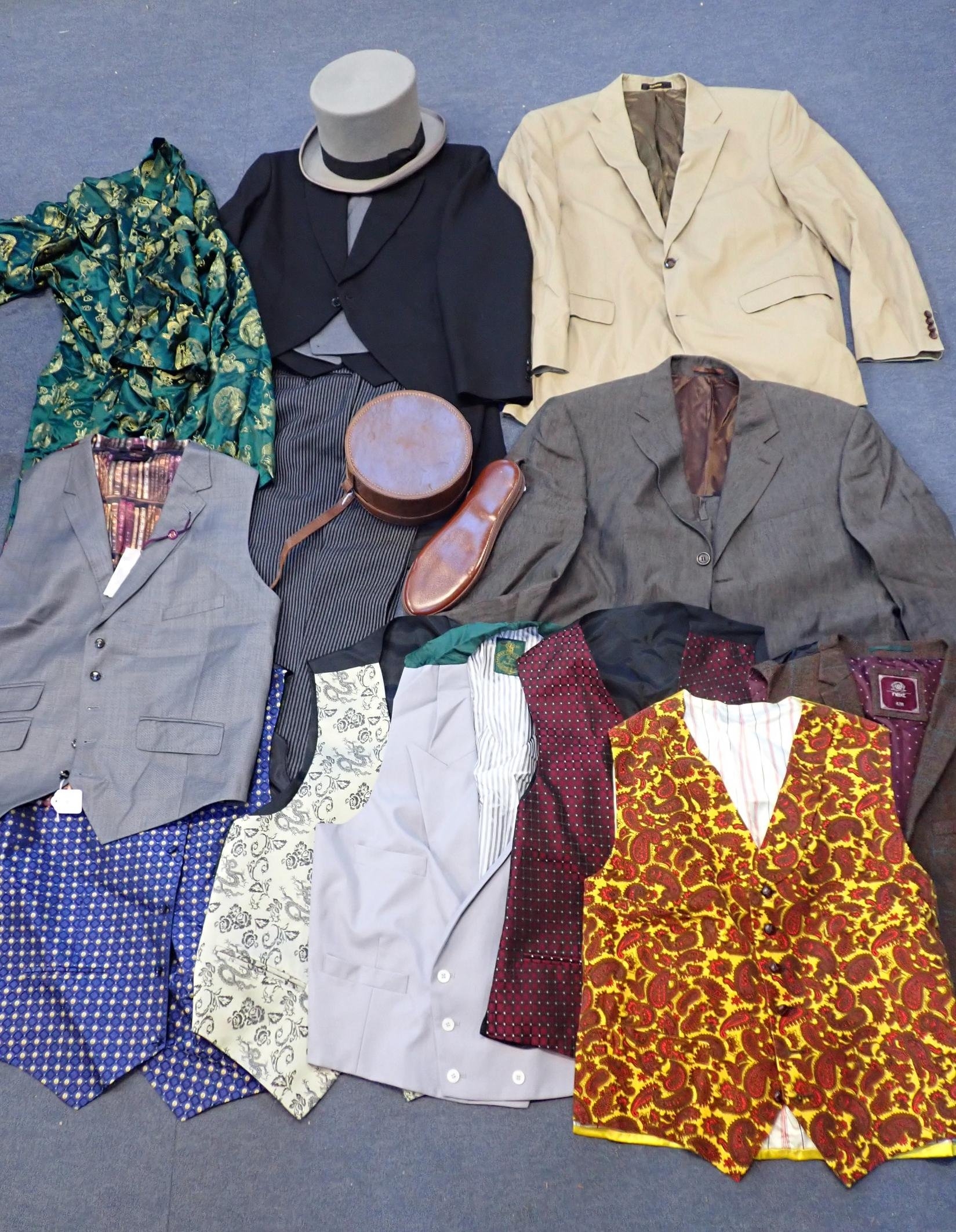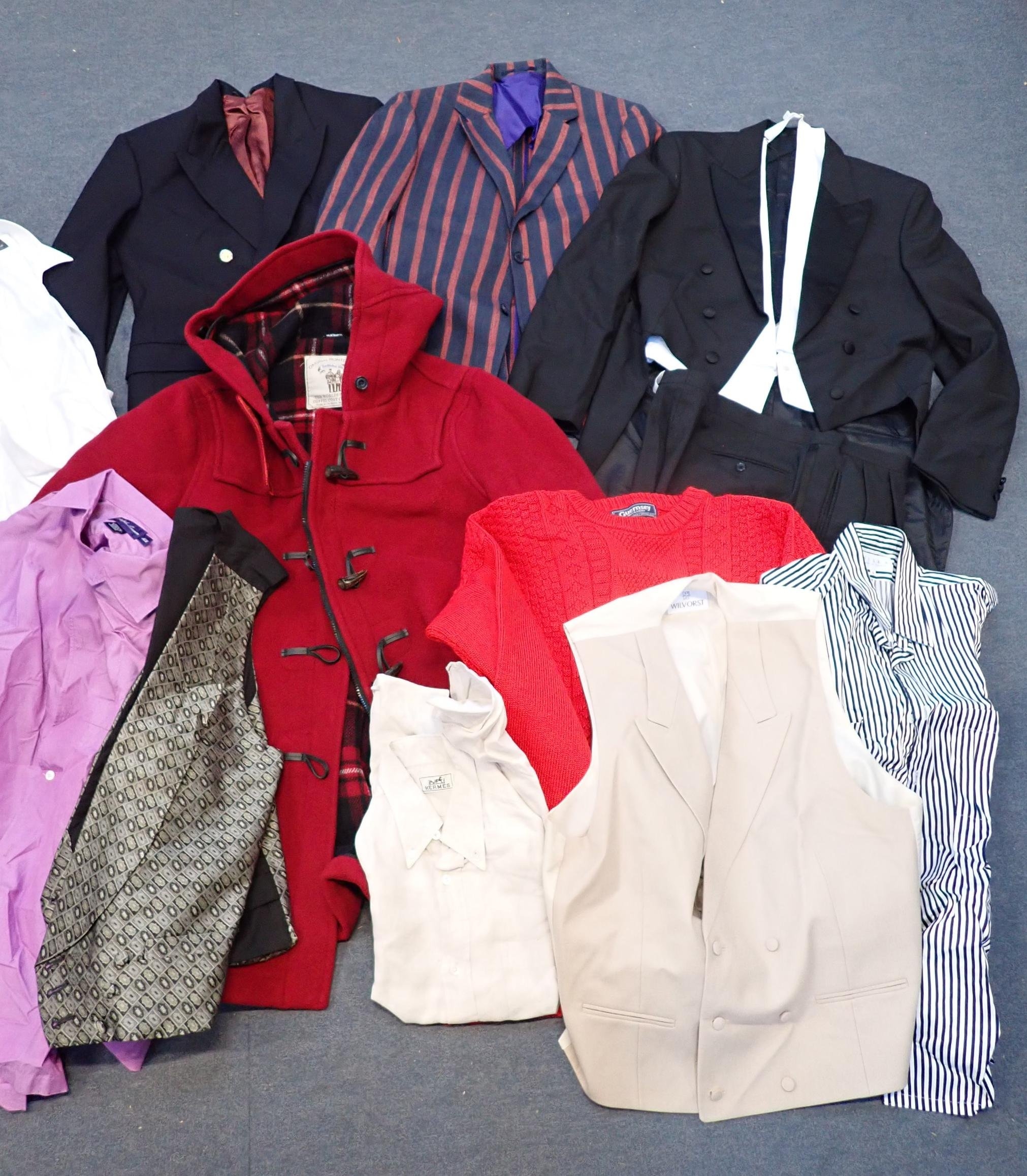 including morning suit, evening dress, Barbour summer jacket, Chinese silk dressing gown, collar box, cased travel slippers, fancy waistcoats, duffle coat, etc (various sizes)