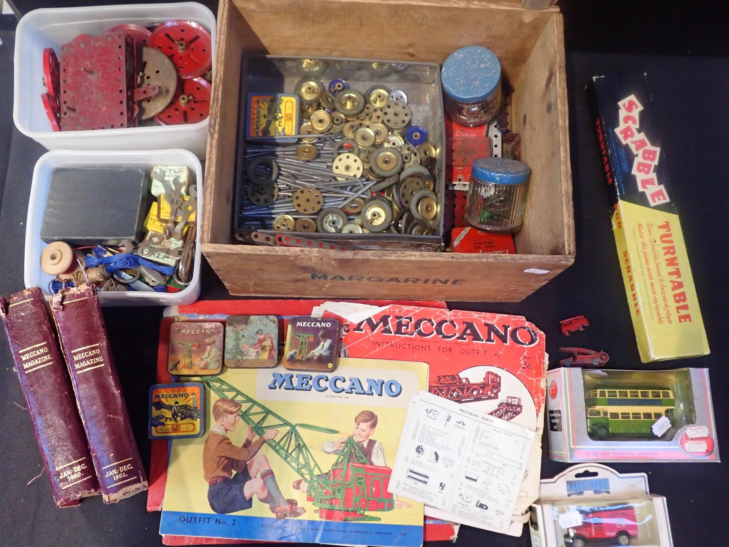 including tins of nuts and bolts, in an old margarine crate, bound Meccano Magazine 1950-51, other related ephemera, with a Scrabble turntable, and diecast models