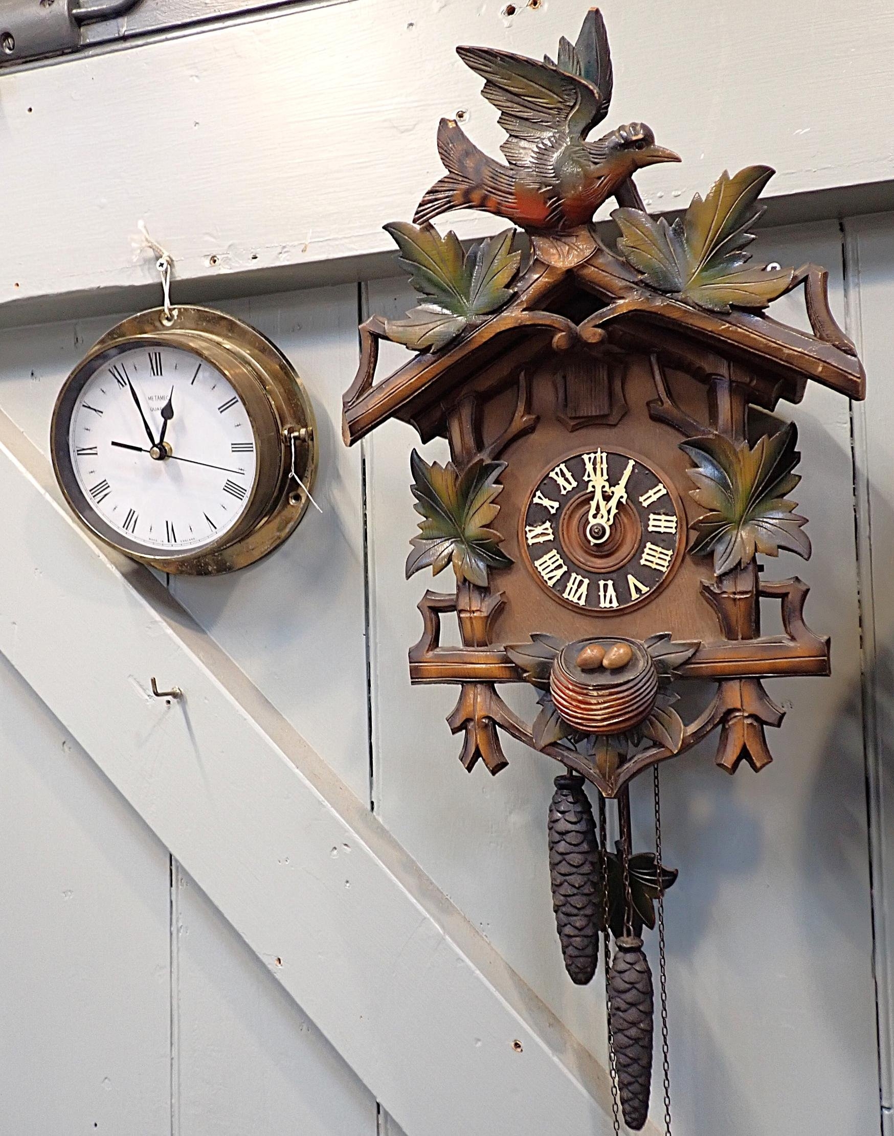 of traditional type, carved and coloured, mid-20th century (running), and a quartz ship's style clock (2)