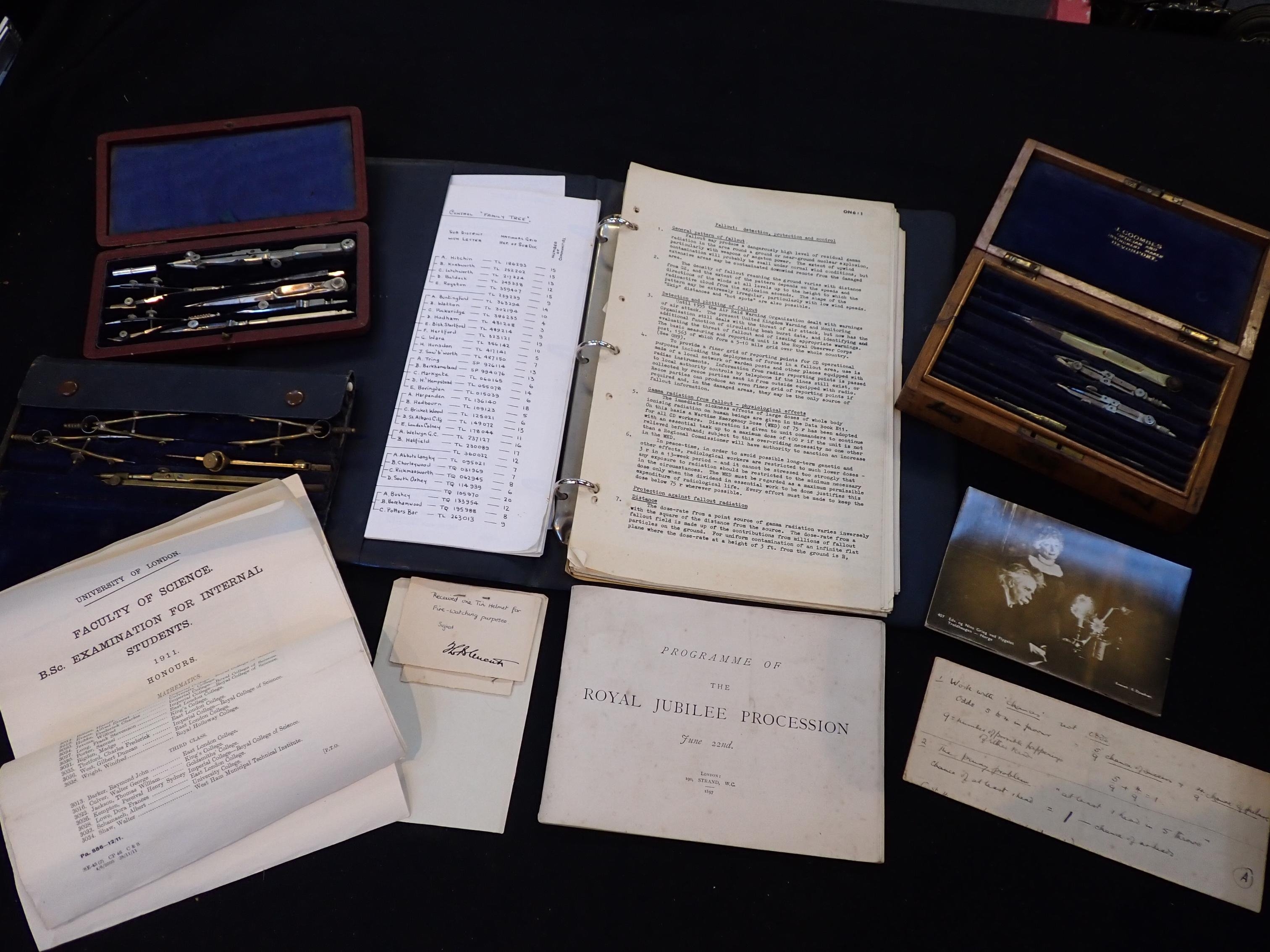 a 1943 reciept for 'One tin helmet for fire-watching purposes', cased drawing instruments, and other items