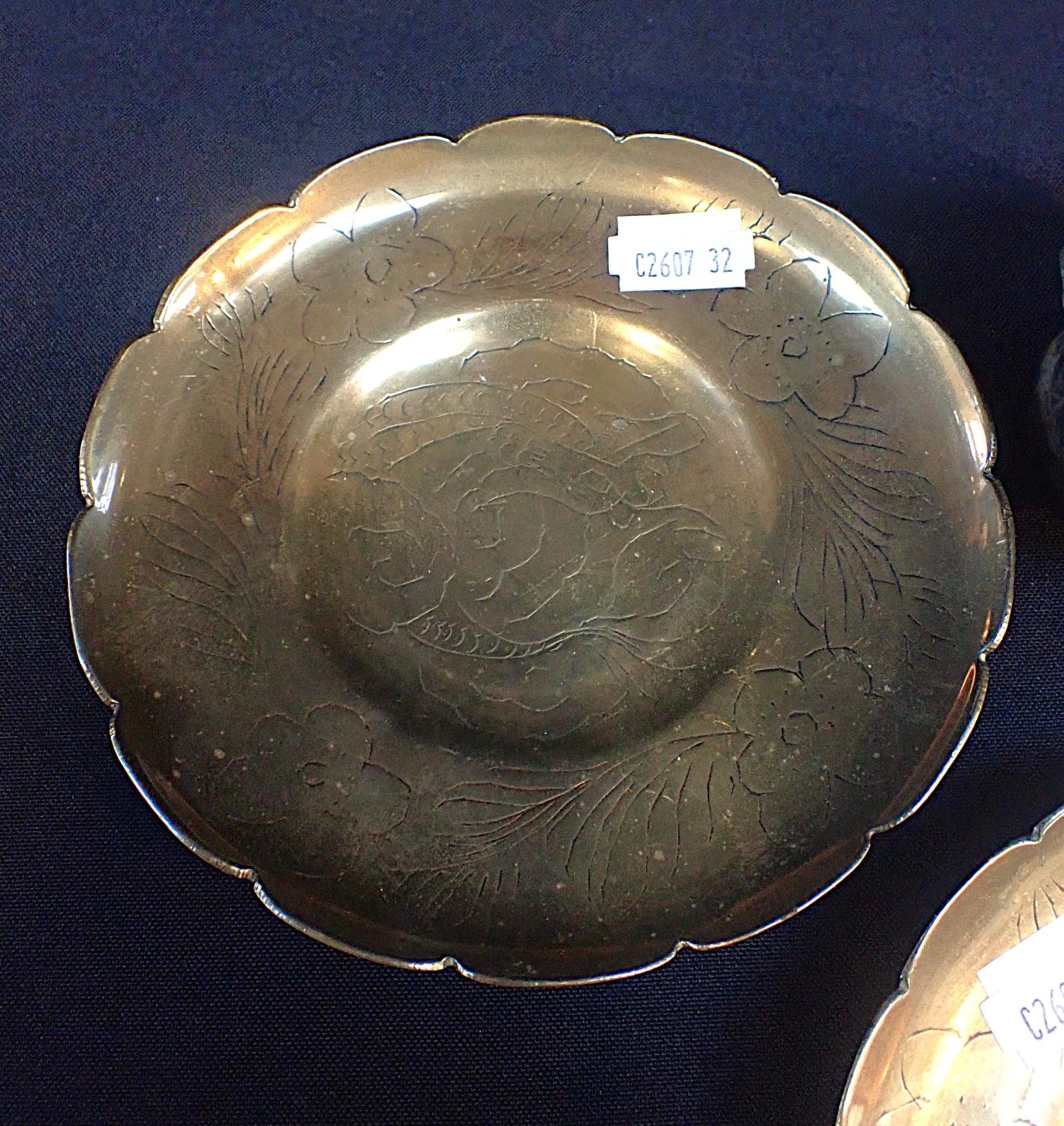 with figural legs, 5.5cm high, a copper dragon vase, and a pair of Chinese brass dishes (4)