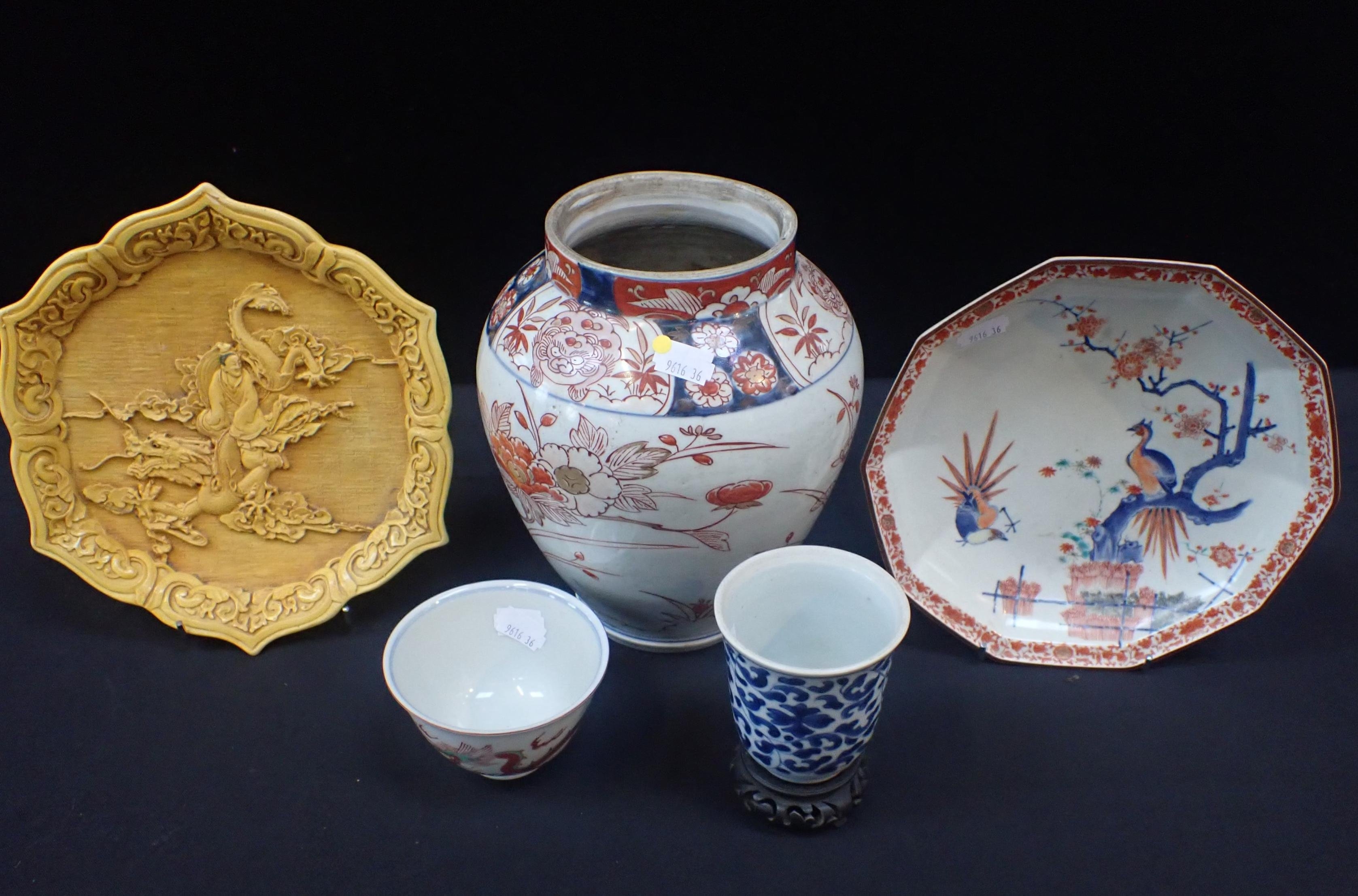 including an Imari jar (lacking cover), a ten-sided dish, a bowl on wooden stand, and a blue and white cup, with a replica yellow lacquer dish (5)