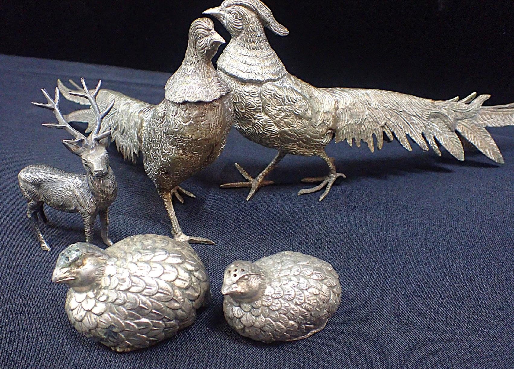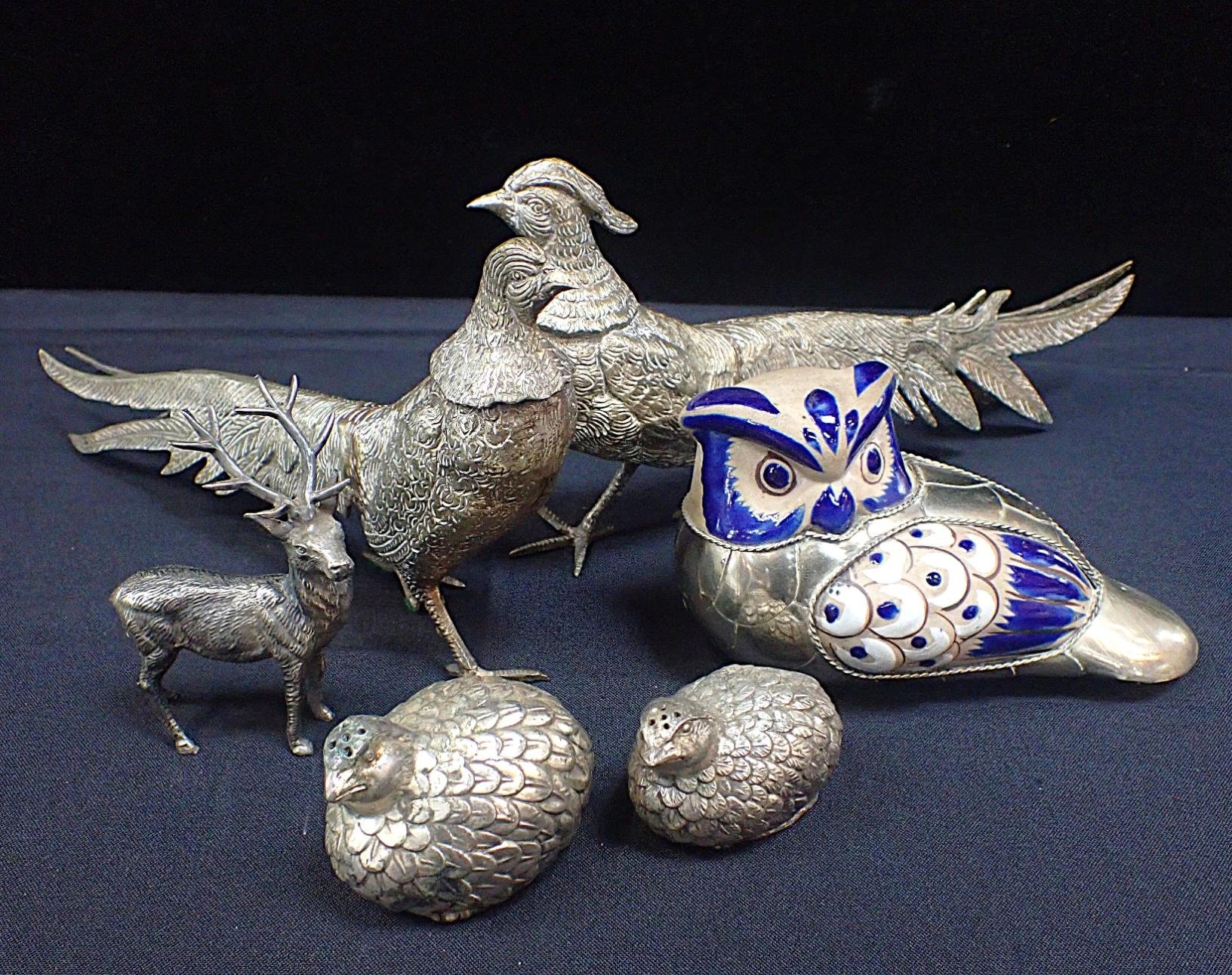 with a pair of silver plated partridge pepper pots, a stag and owl figure (6)