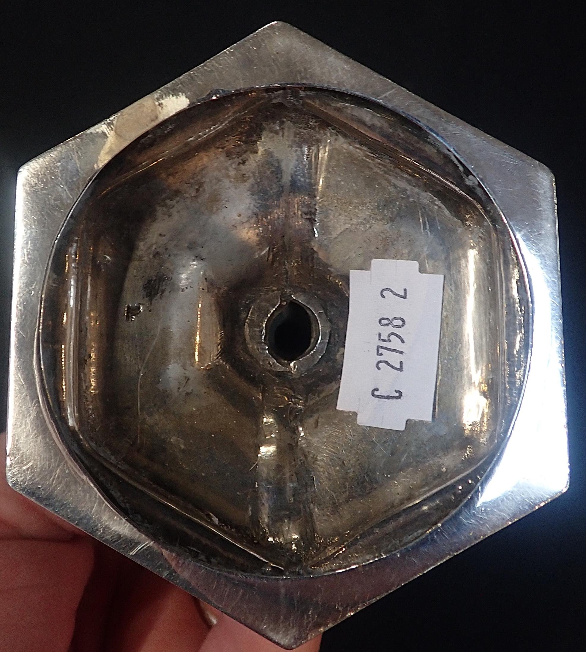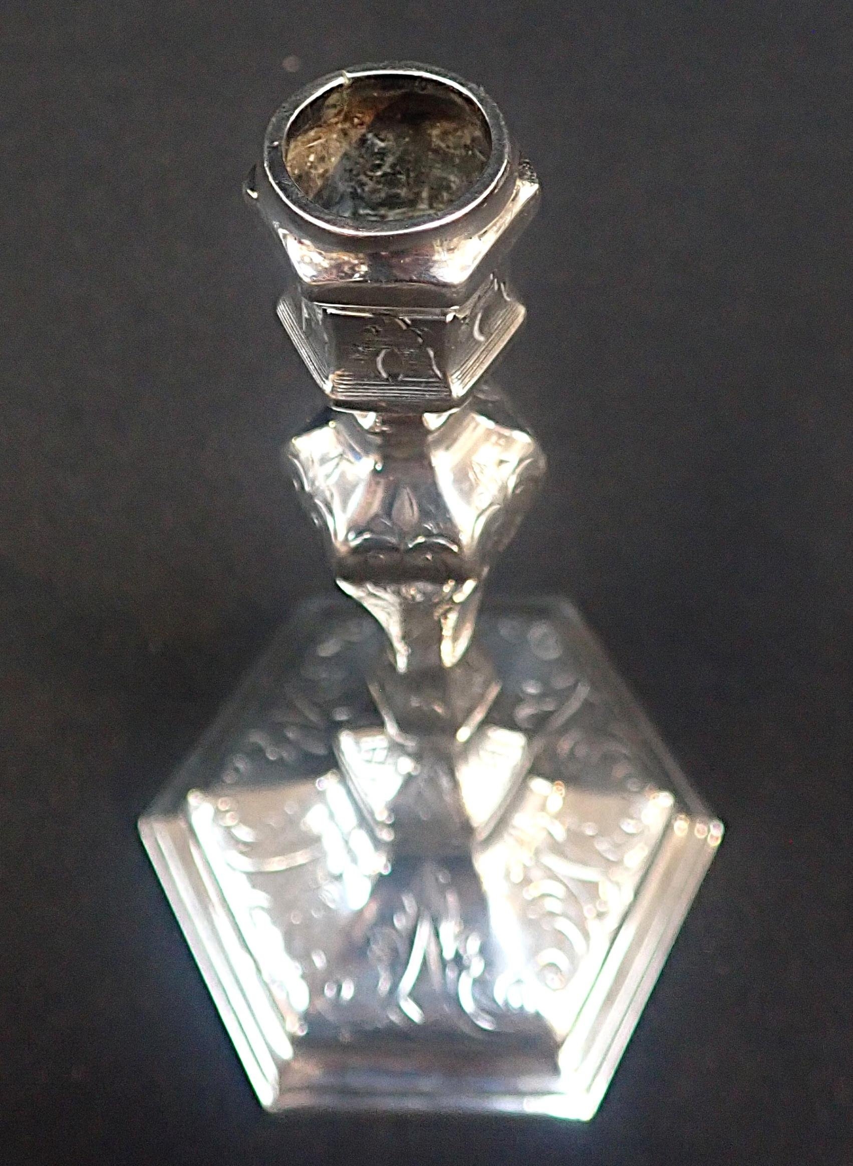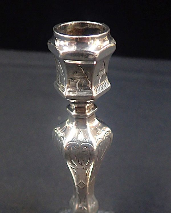 in 18th century style, with baluster stem hexagonal base and engraved decoration, 13.5cm high