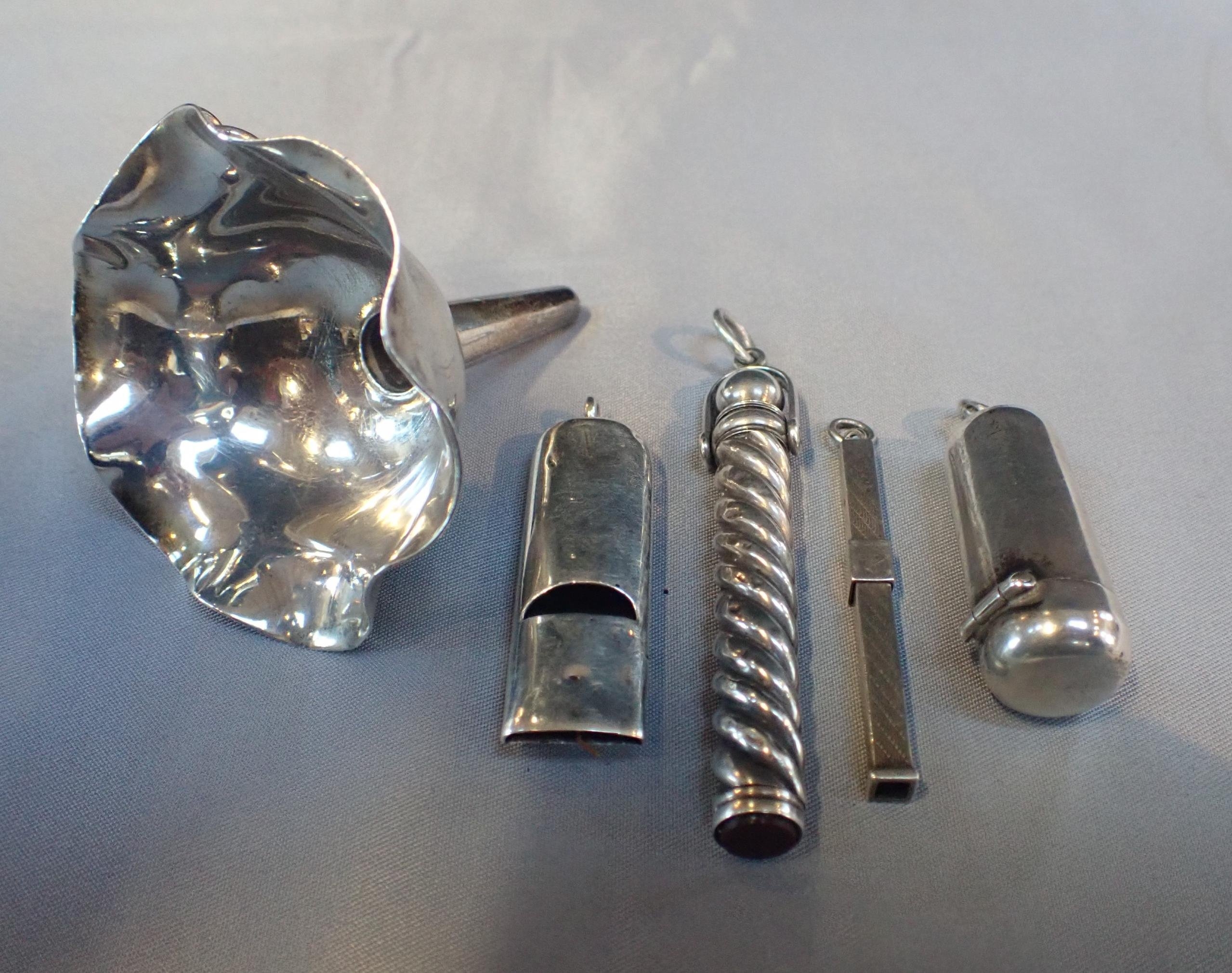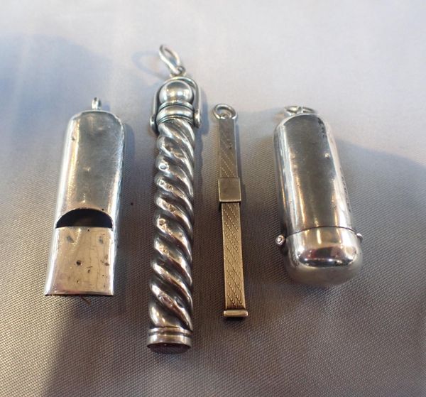 With a silver whistle (some dents) and three small silver chatelaine items (5)