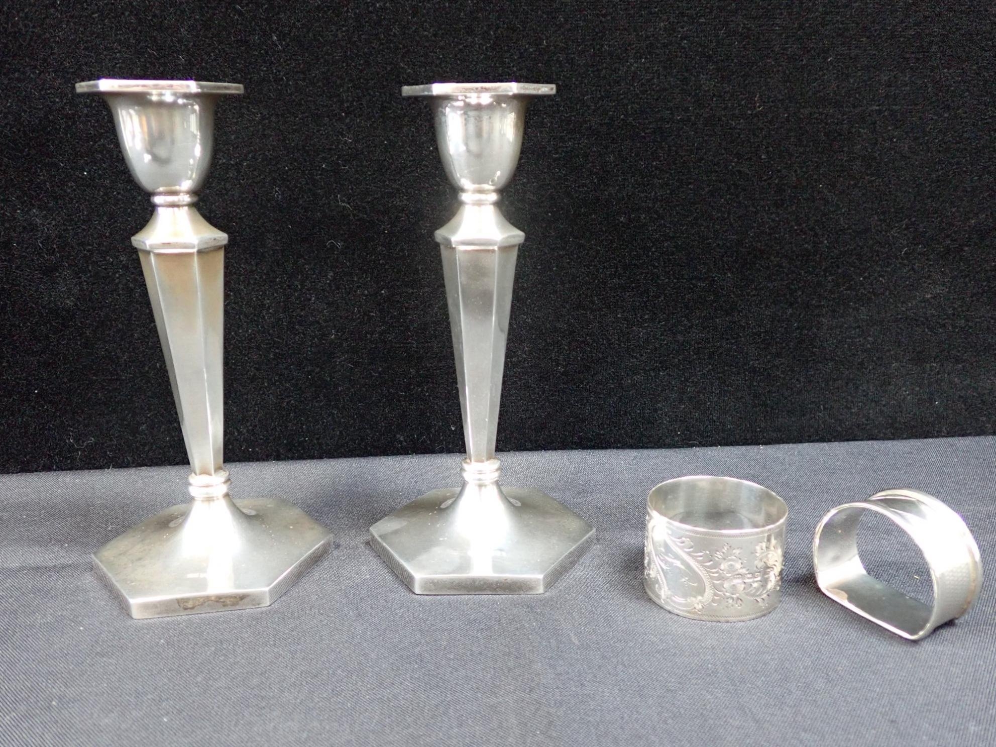 on spreading bases, Walker & Hall, Sheffield 1958 (filled), and two silver napkin rings