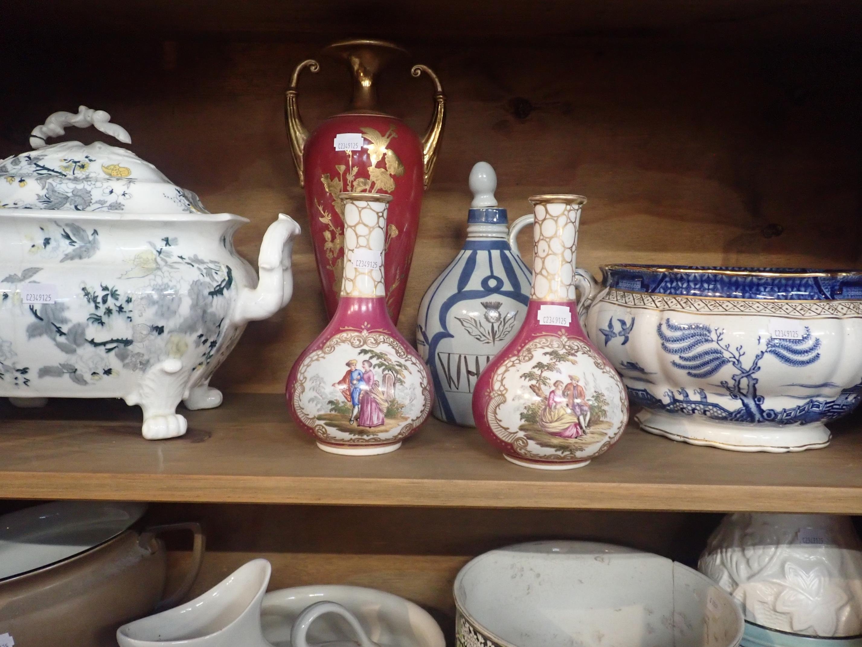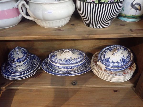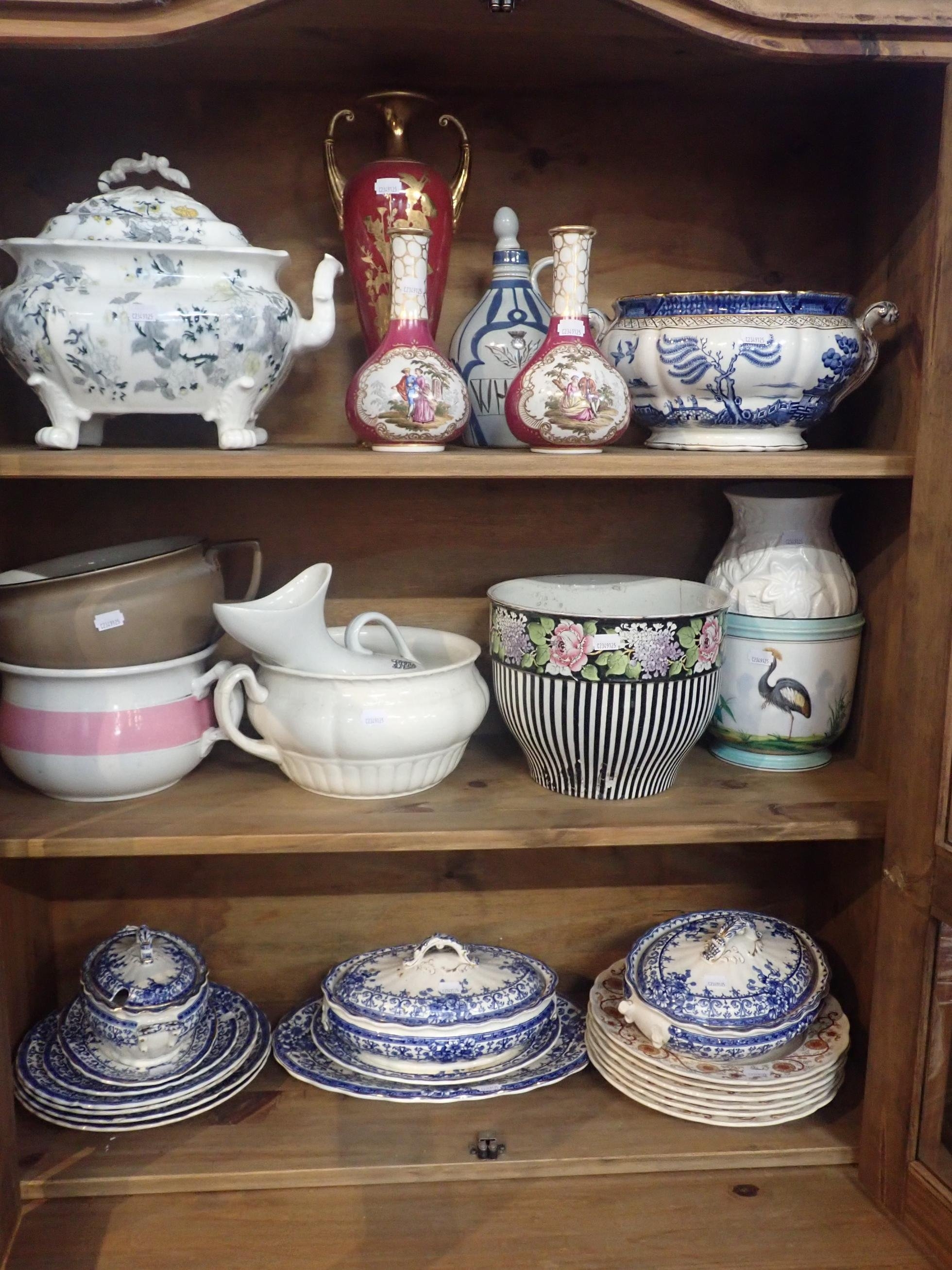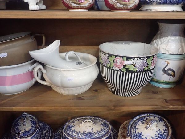 including jardinieres, blue and white tableware Keeling & Co Oxford pattern, vases, chamber pots etc.