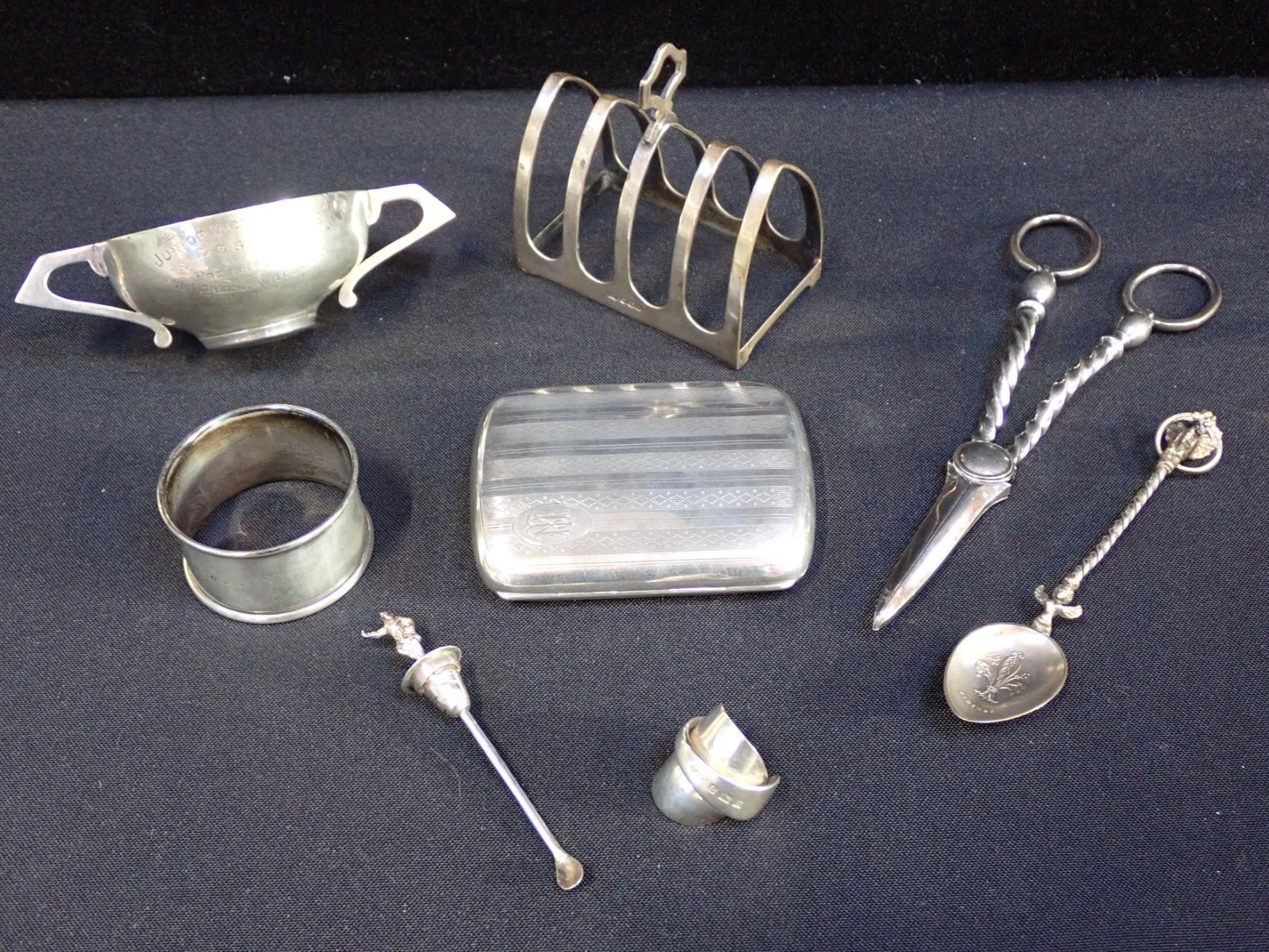 including a cigarette case, toast rack, etc, with a white metl 'Firenze' souvenir spoon, and a pair of plated grape scissors