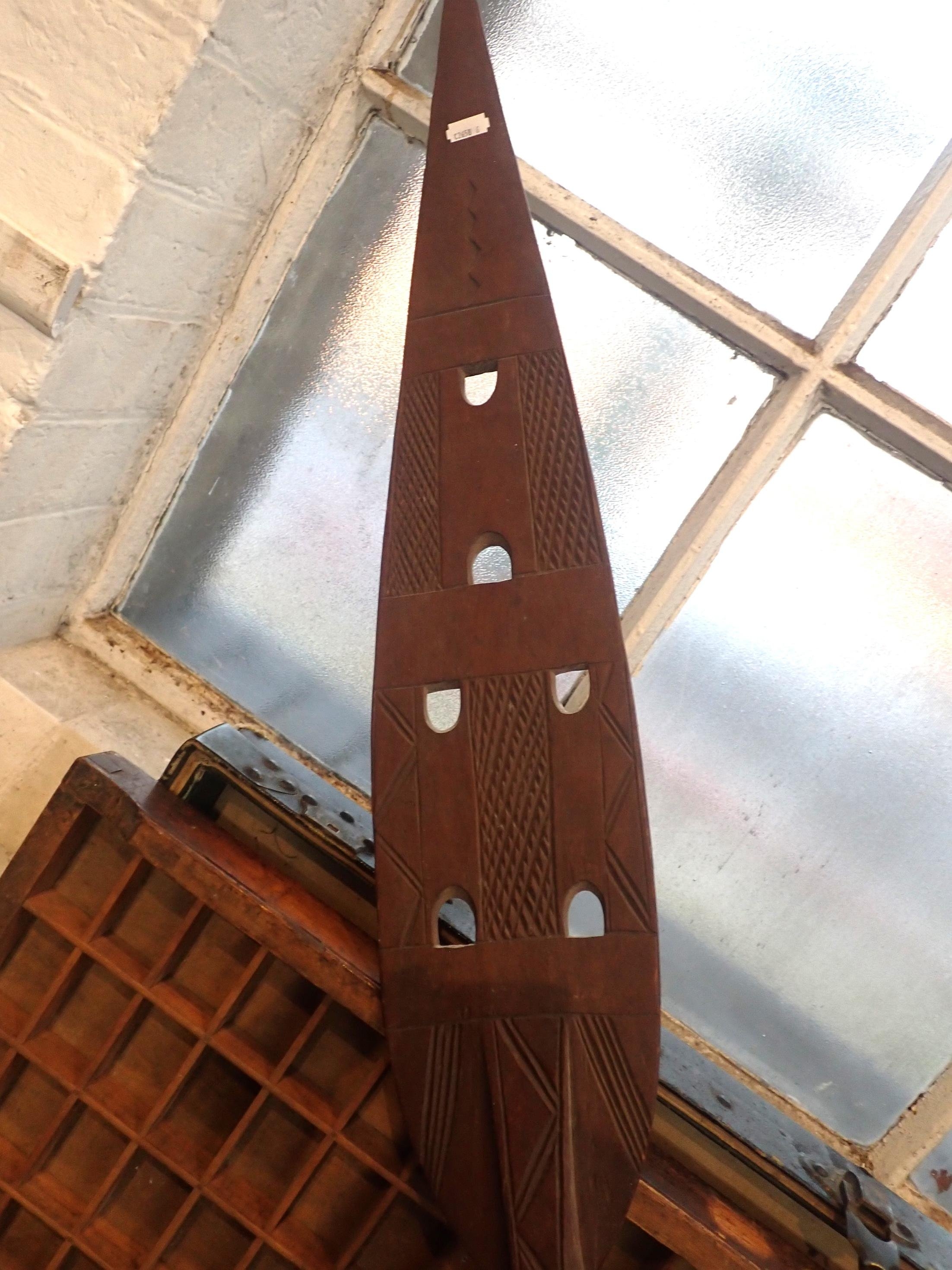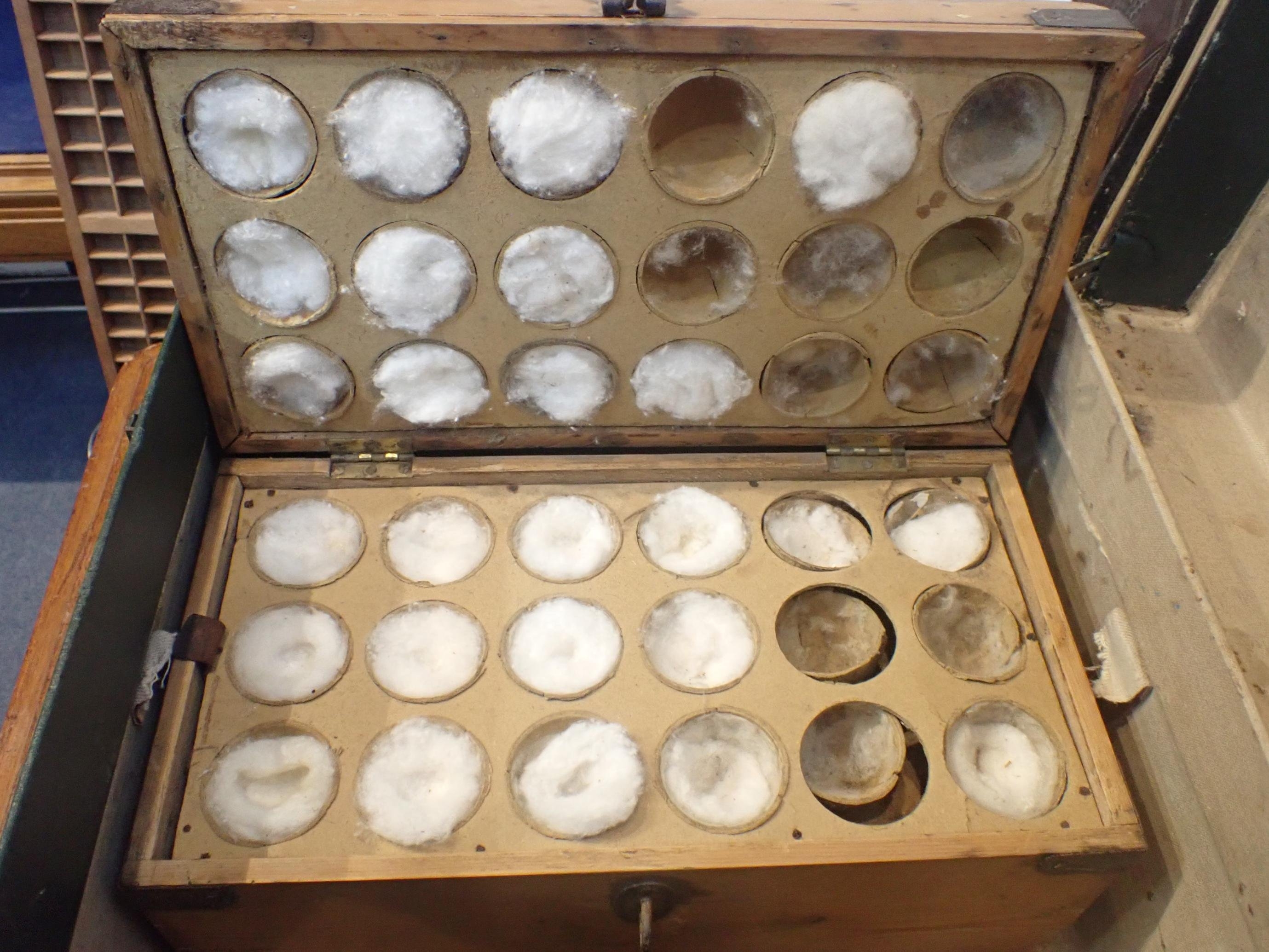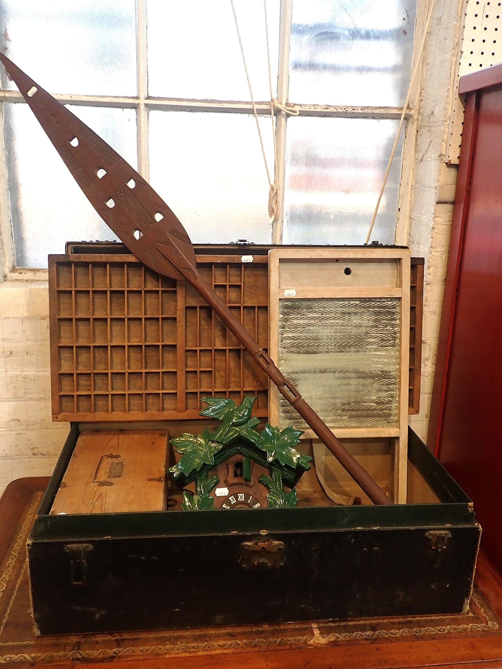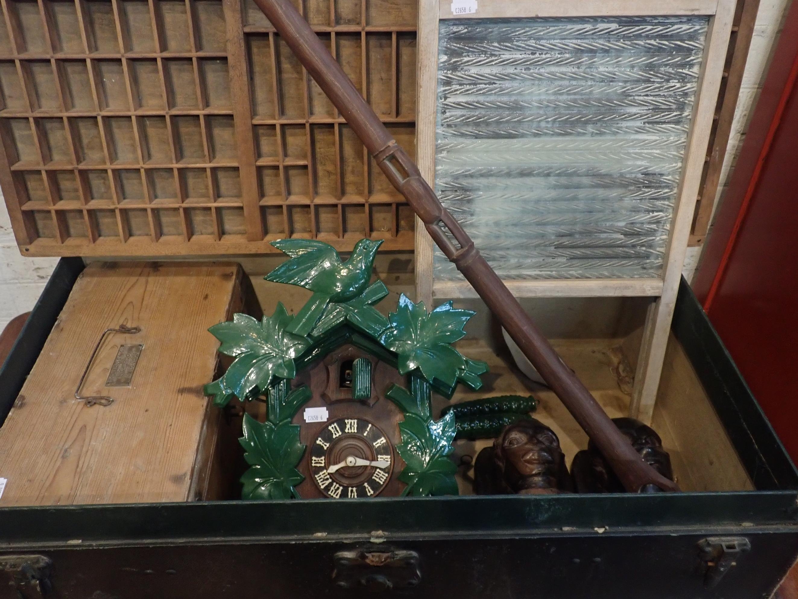 including a pine egg collectors box, printer's tray, wooden spear, cuckoo clock (partly painted), all in a vintage case / trunk