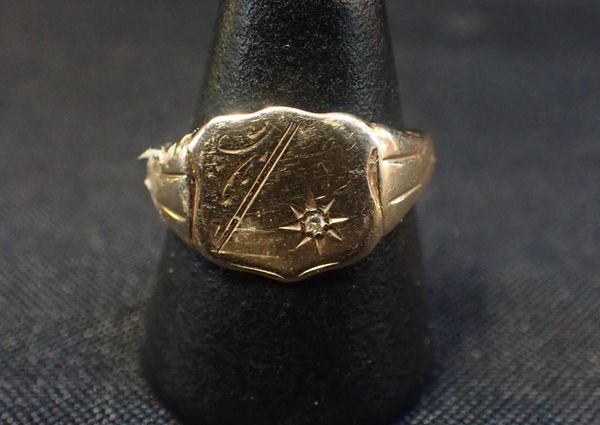 A 9ct GOLD RING, THE SHIELD-SHAPED HEAD SET WITH A SINGLE STONE