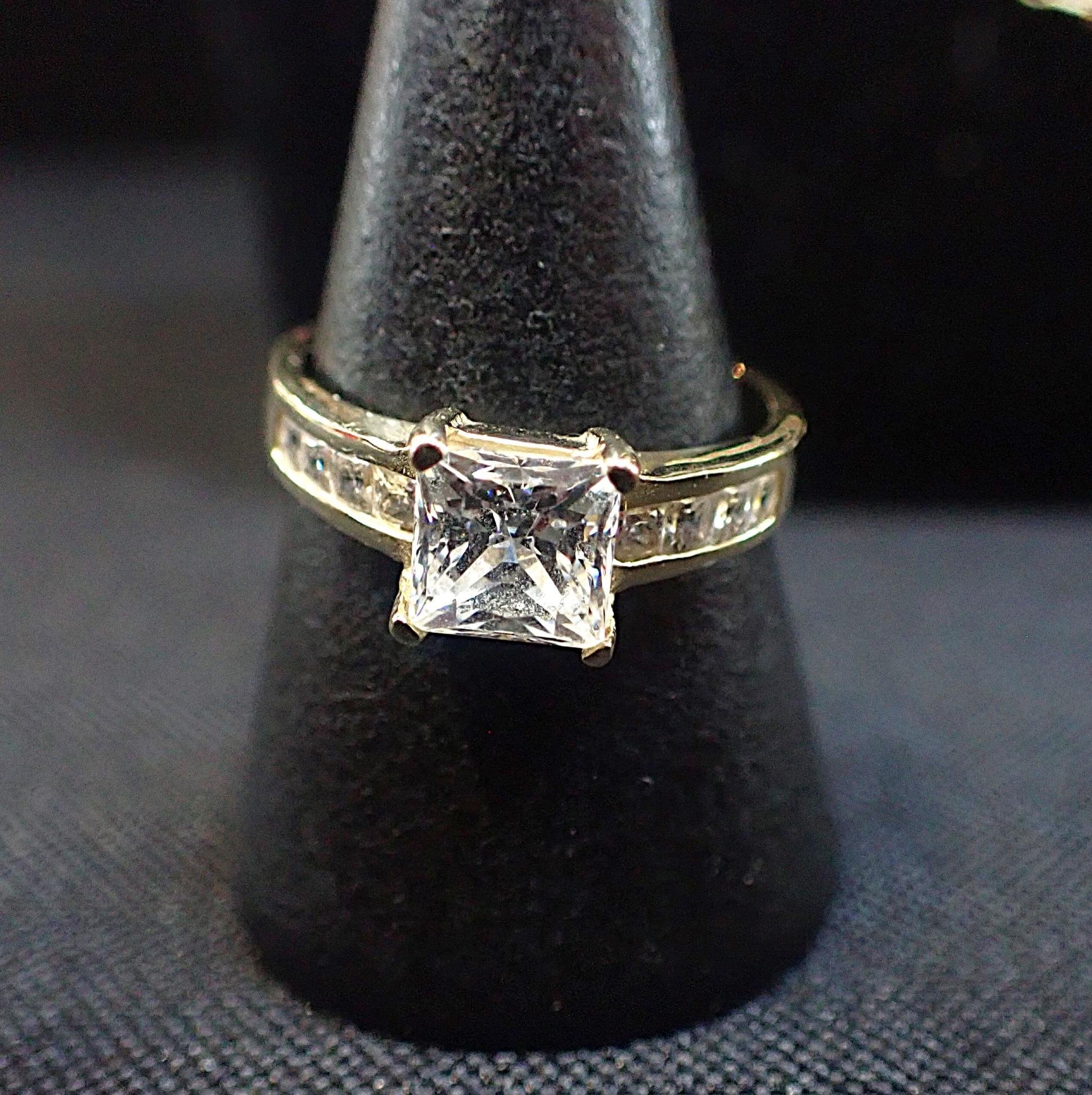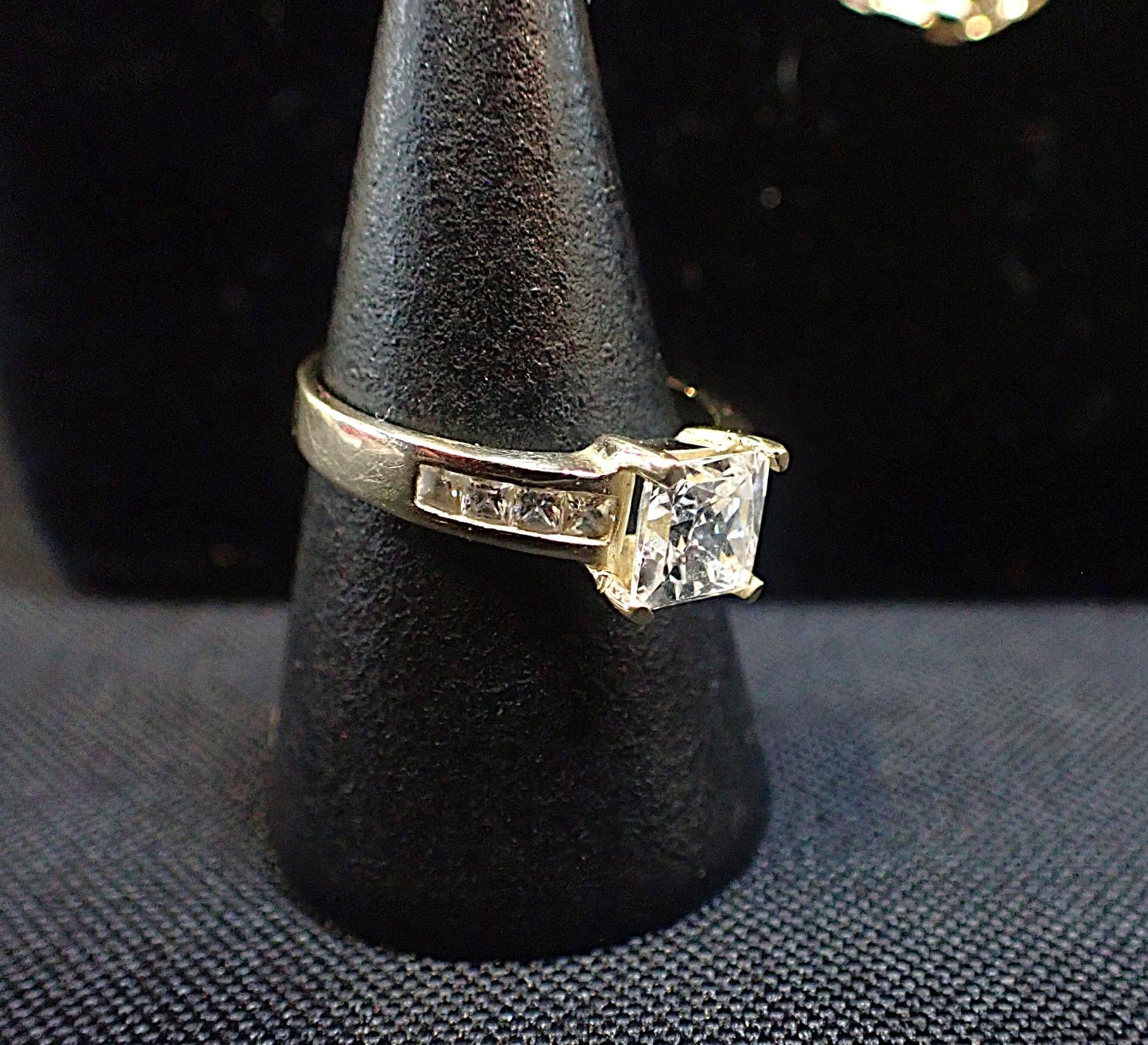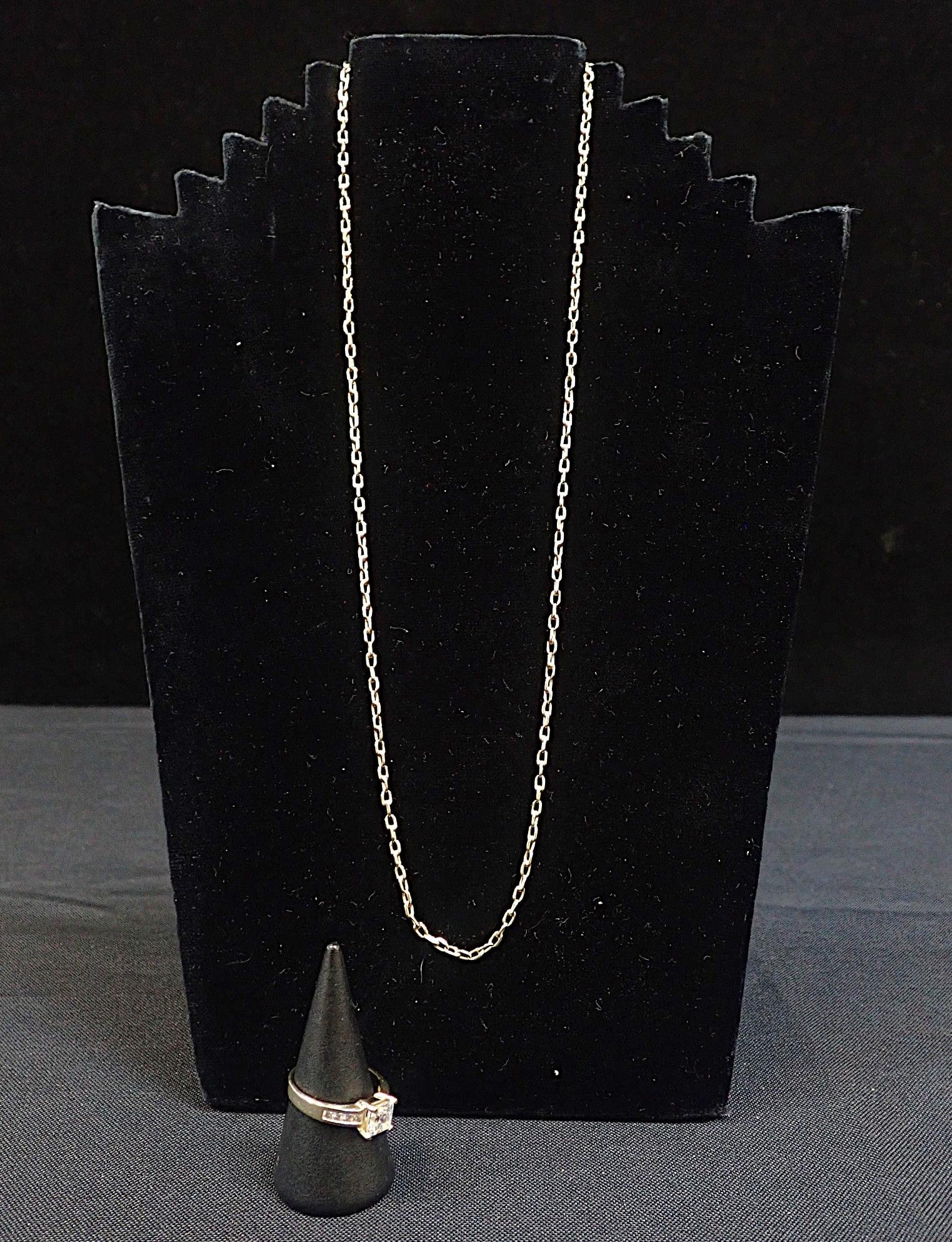 with large square stone flanked by eight smaller, and a 585 marked chain