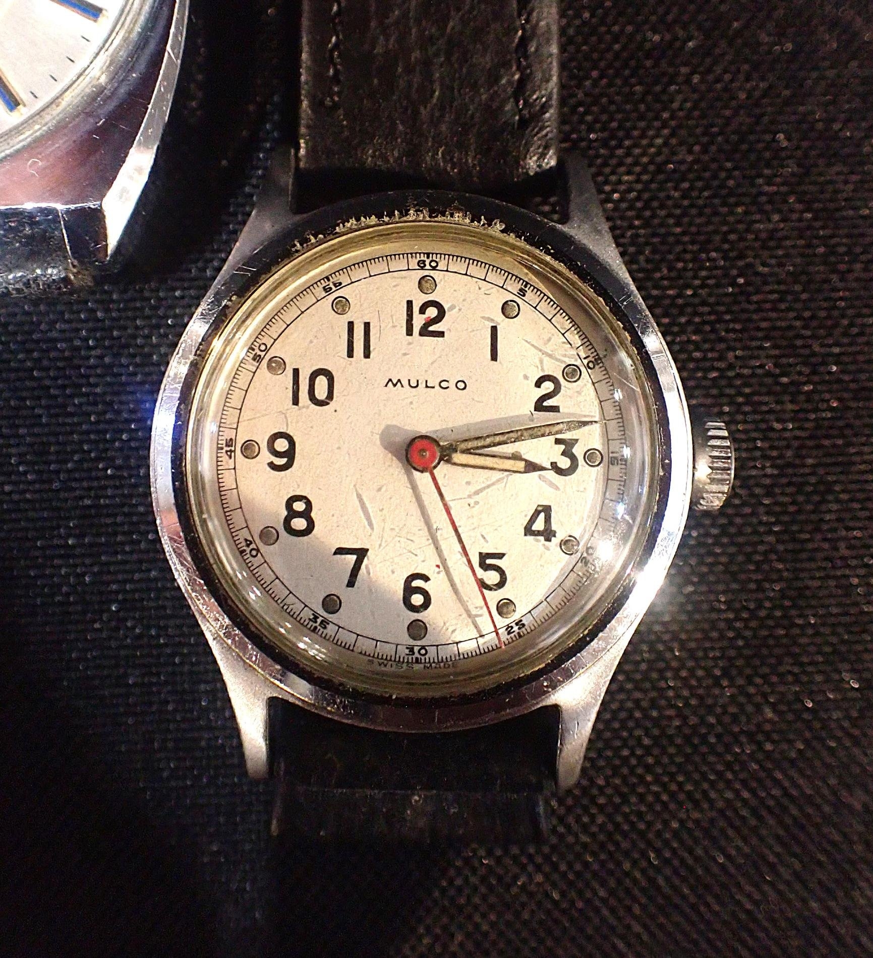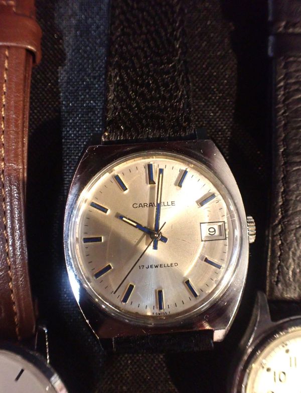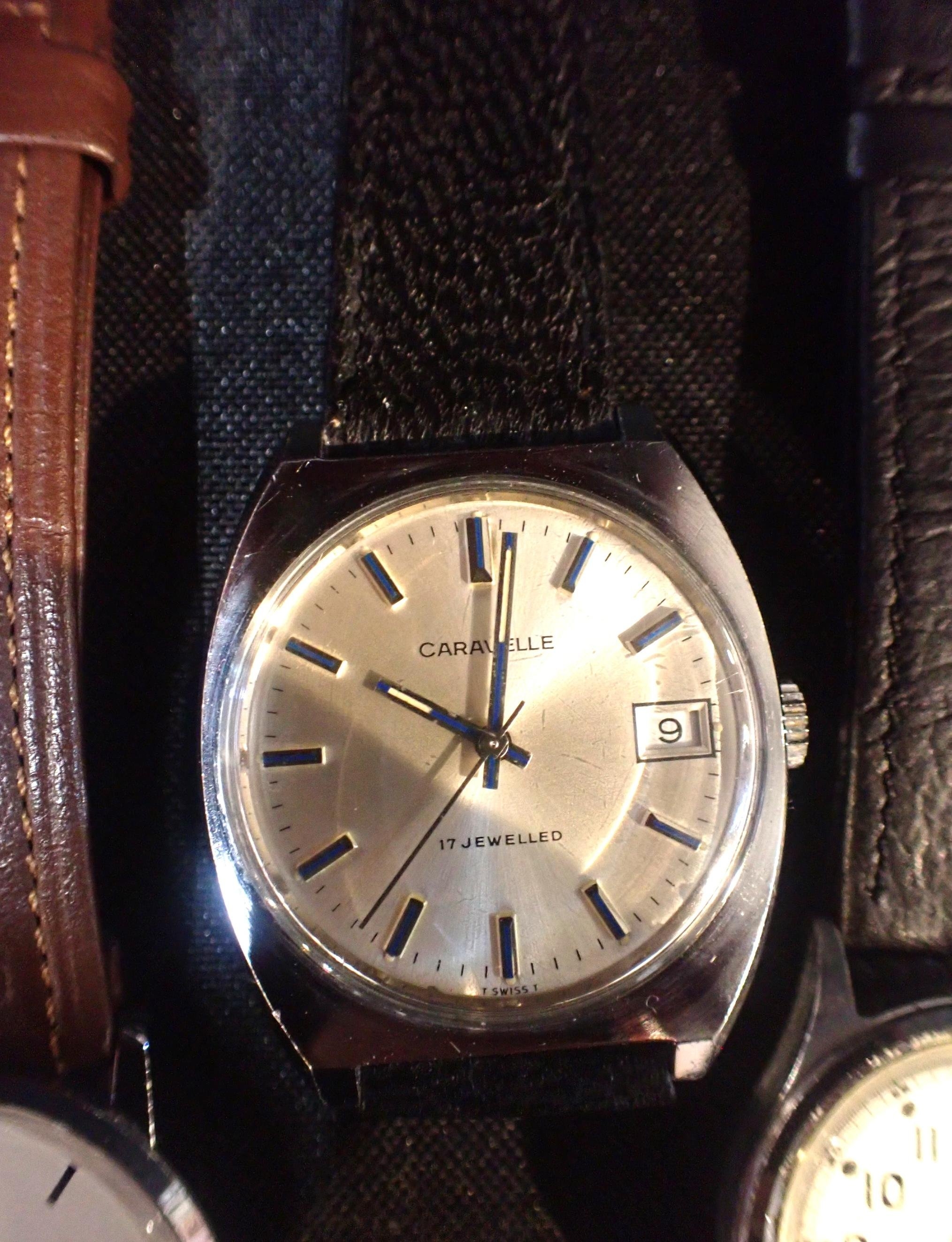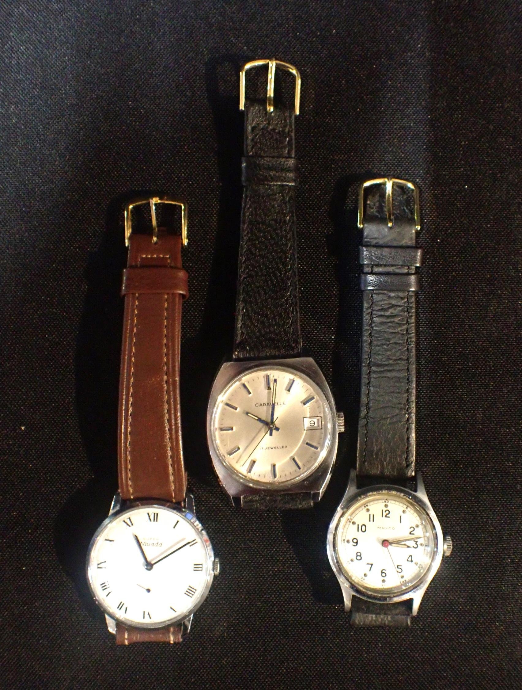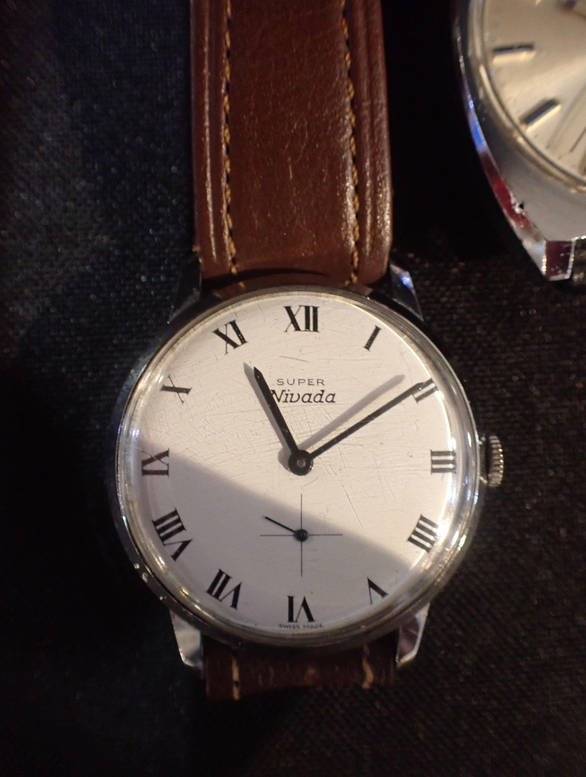 with manual wind movement, white dial, black roman numerals, dark blue steel hands; together with two other gentlemen's wrist watches (3)