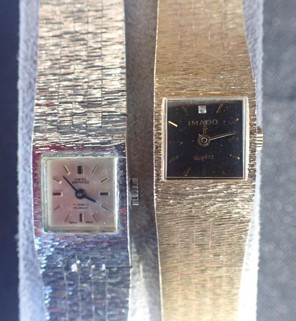 with quartz movement, gold dial, gold batten numerals, gold hands, on a red leather strap, circa 1980s; together with two other ladies wrist watches (3)