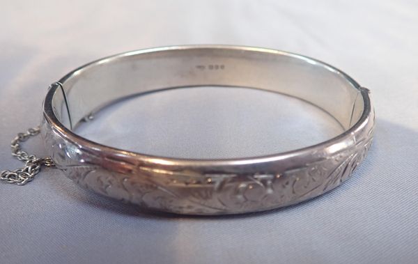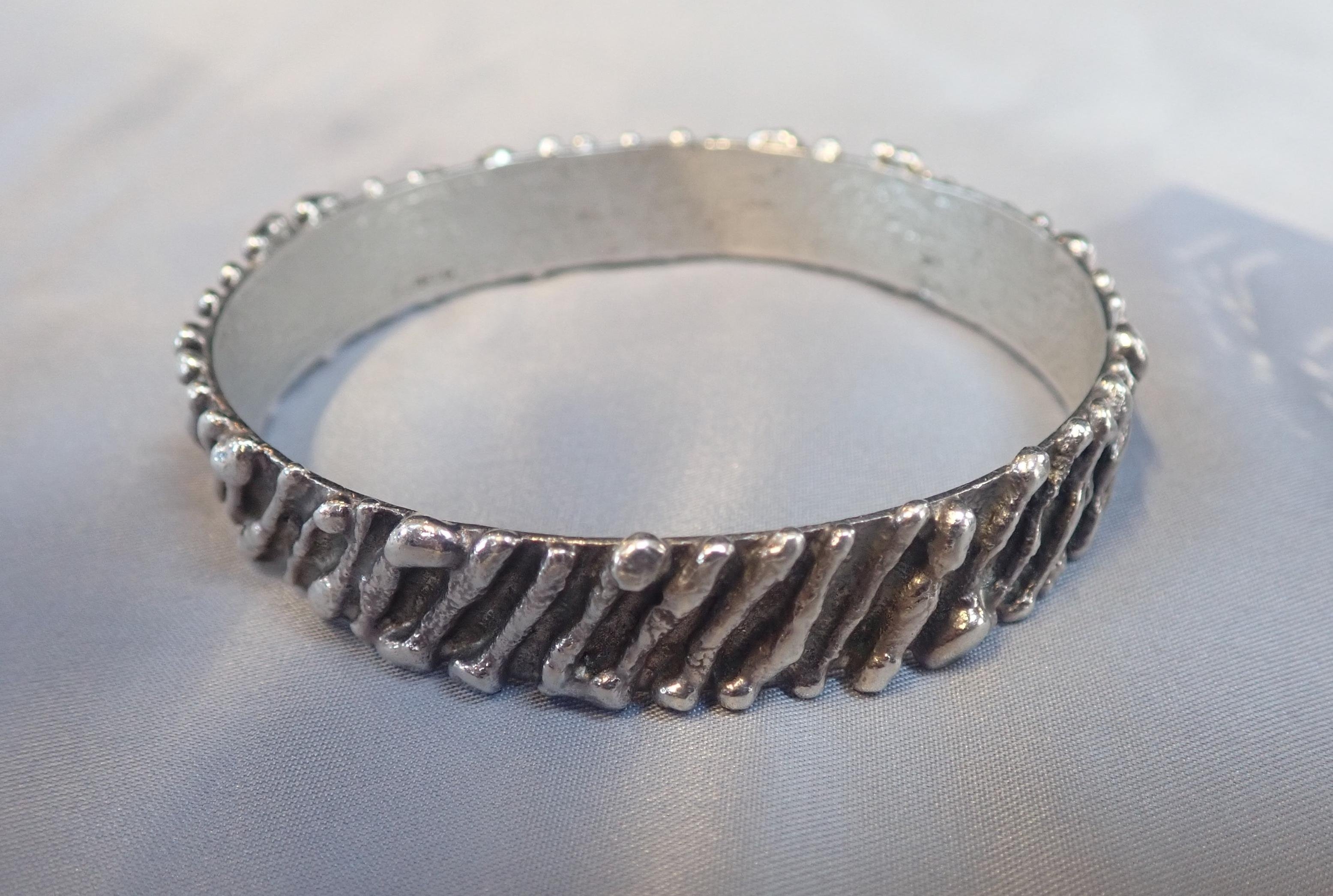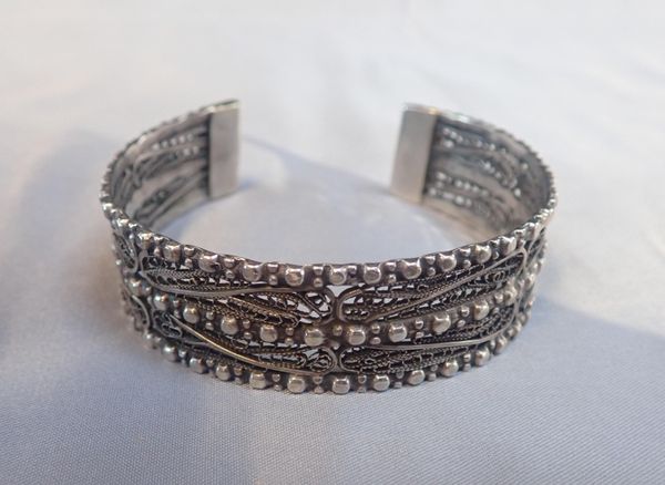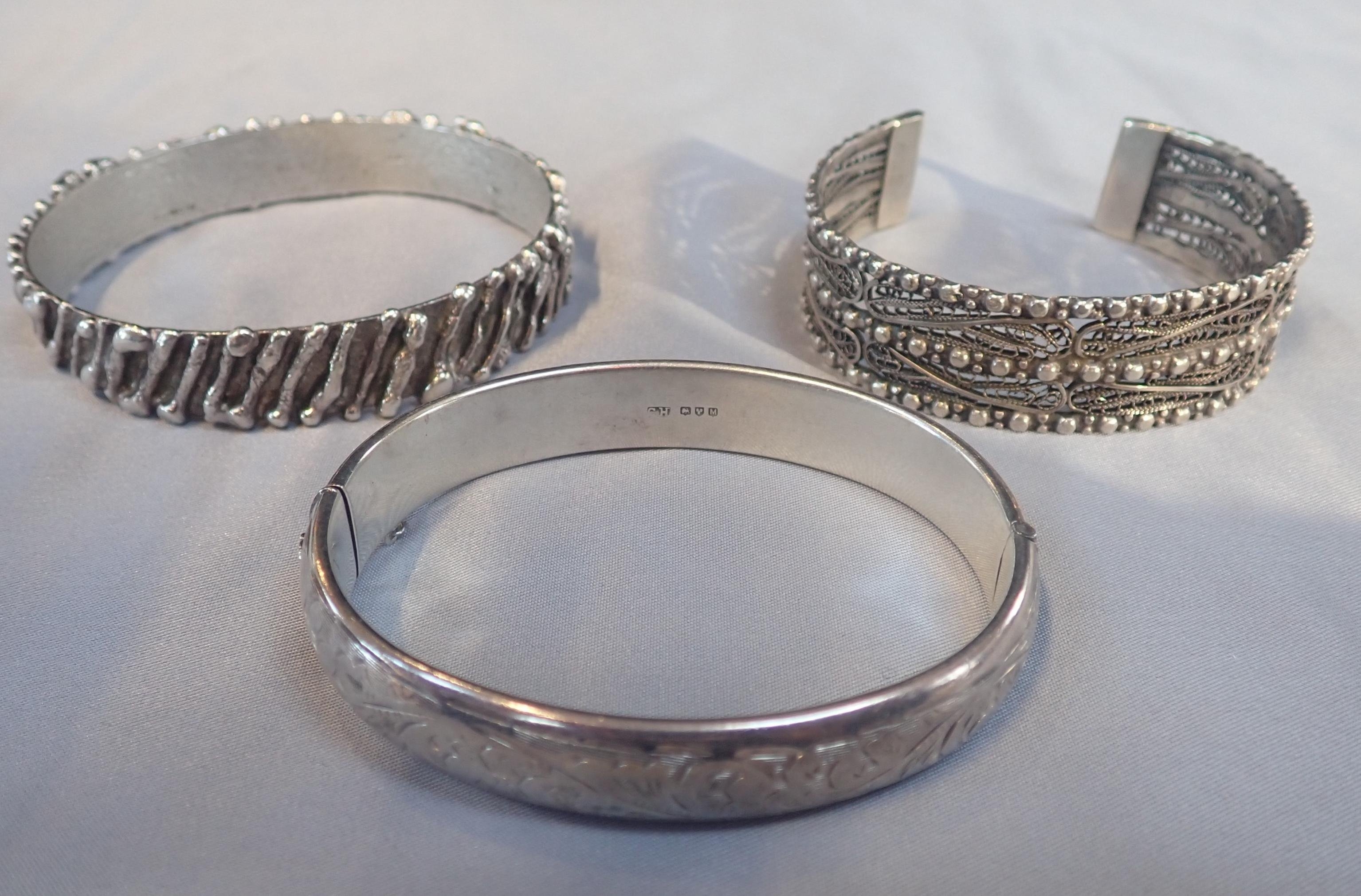 another silver bangle, and a white metal filigree bracelet (3)