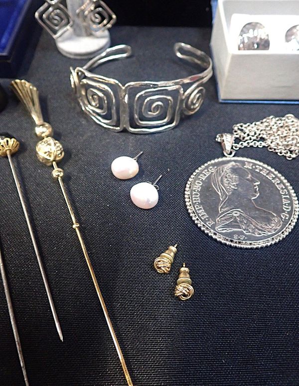 to include a string of cultured perals with white metal clasp stamped 750, a quartz dress ring in hallmarked 9 carat gold, a stick pin stamped 9ct and other white metal jewellery stamped 925
