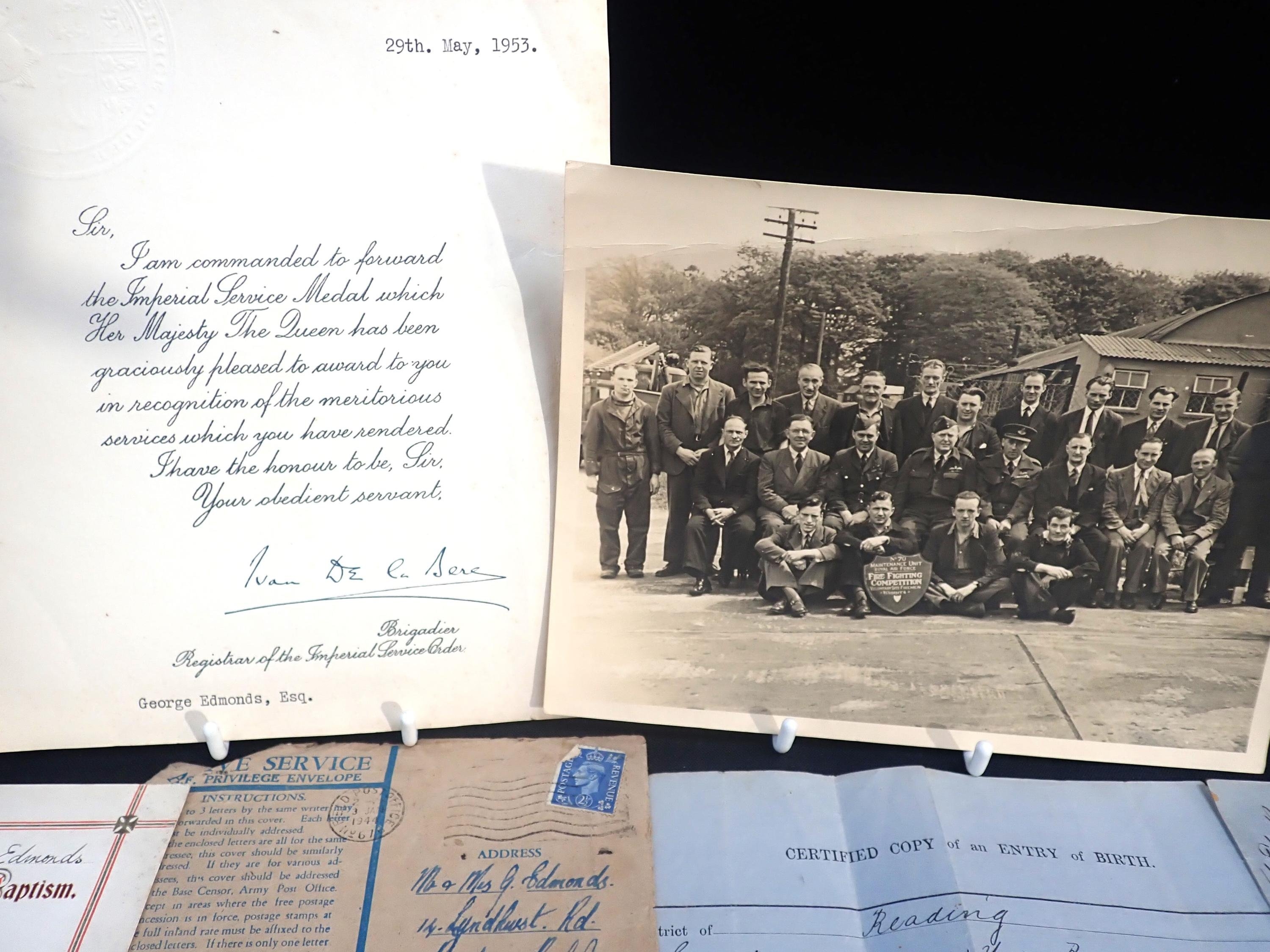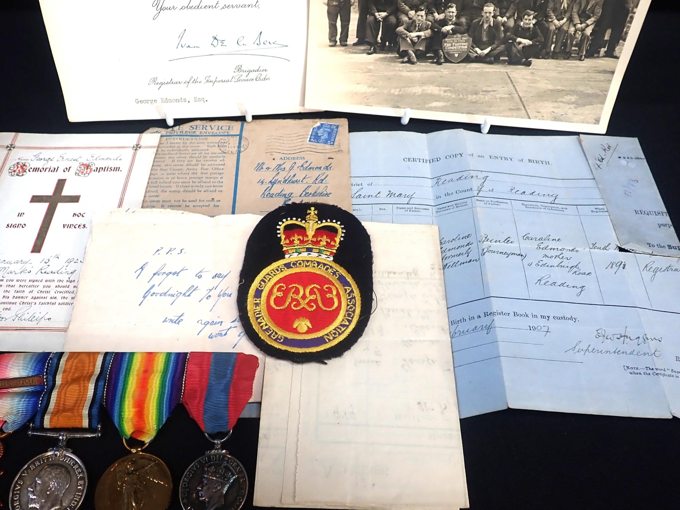 1914 Star with mons bar (14901 Pte G. Edmonds, 2/6 G. Gds), British War and Victory Medals (14901 Pte. G. Edmonds. G. Gds), Imperial Service Medal, G.VI.R (George Edmonds); with certificate for the Imperial Service Medal and assorted paperwork
