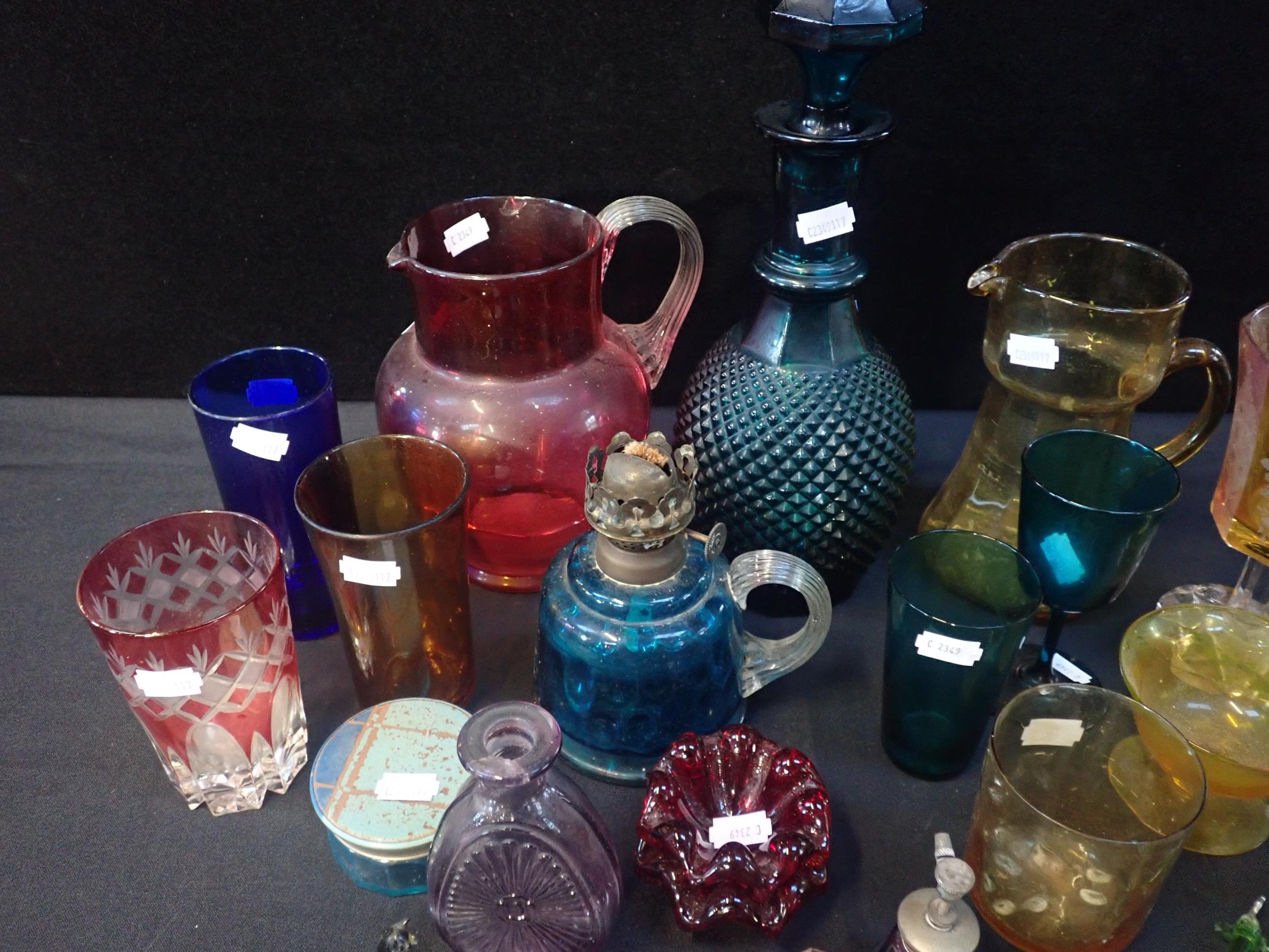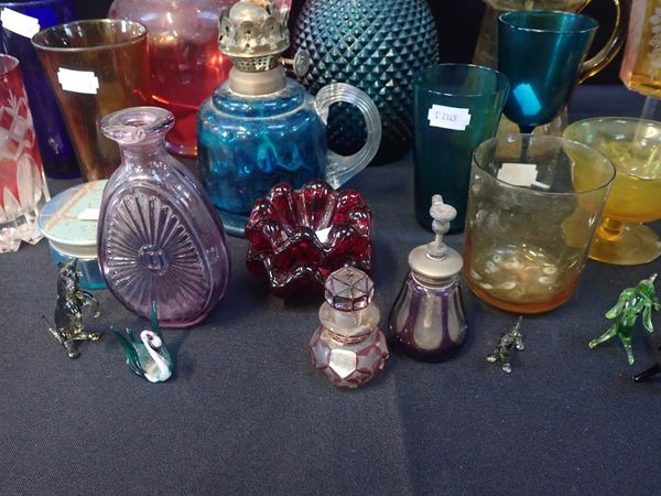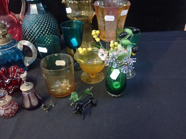 including a decanter, jugs, drinking glasses, a lamp etc. and some glass animals