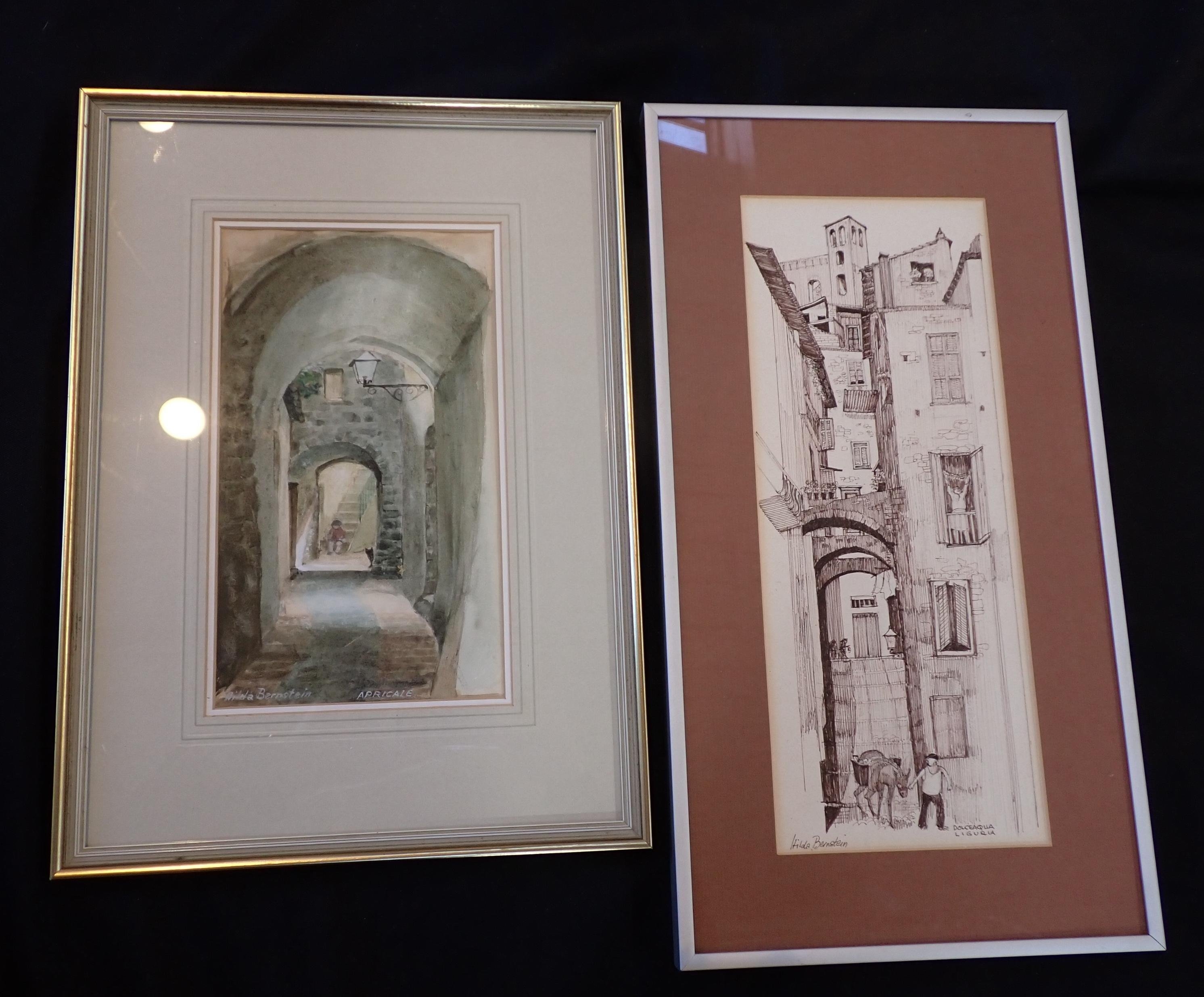 pen and ink, framed46 x 25cm, and 'Apricale', watercolour, framed, 40.5 x 29cm (2)