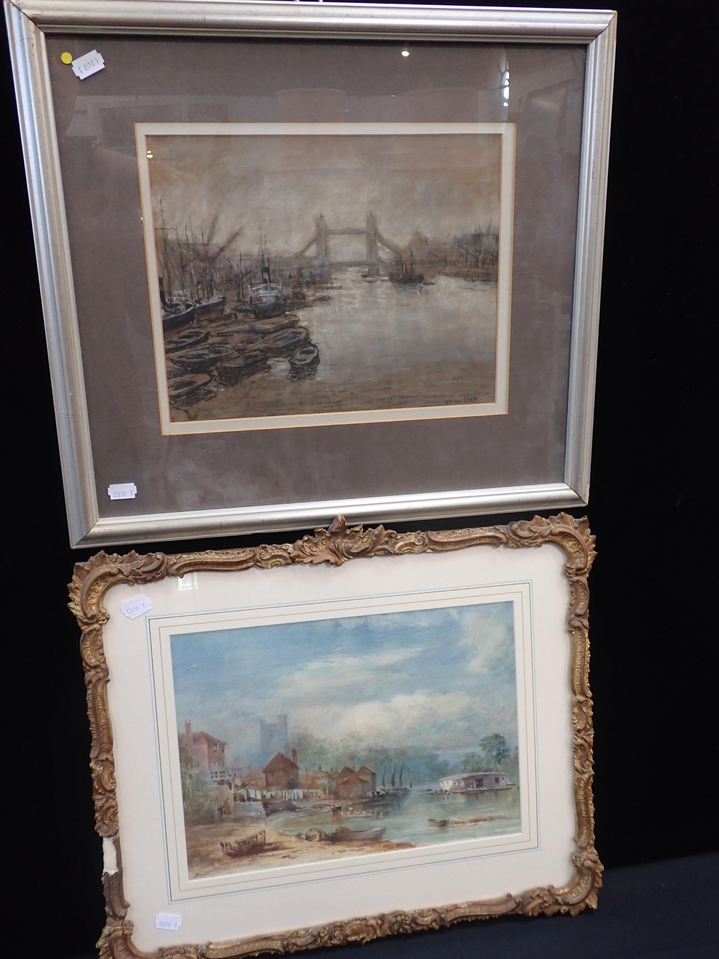 chalk/pastel, framed, 45 x 51cm, and a 19th century watercolour river view, possibly the Thames, in old gilt frame, 43 x 52cm (frame a/f)