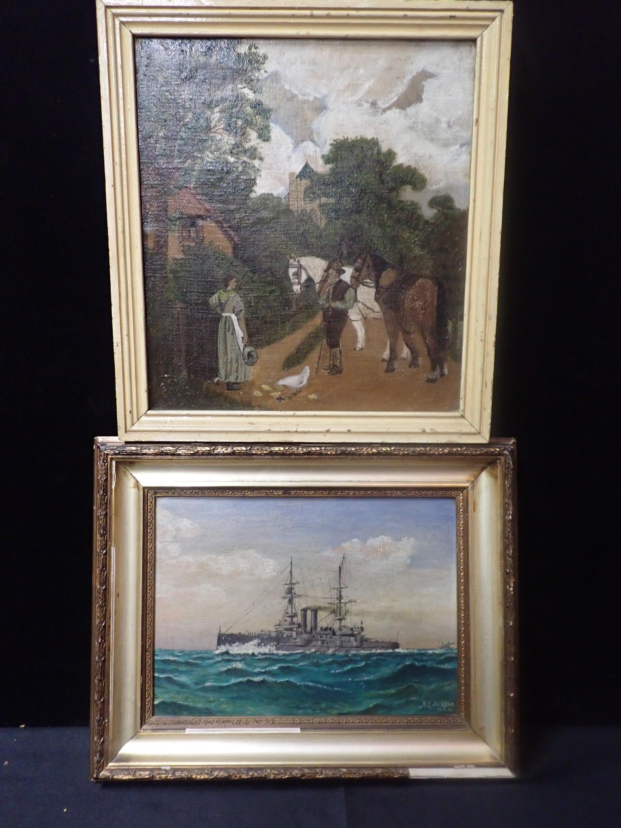 oil on canvas, 1908, framed 37 x 47cm, and a naive oil on canvas 'Goosiping, 1884' (2)