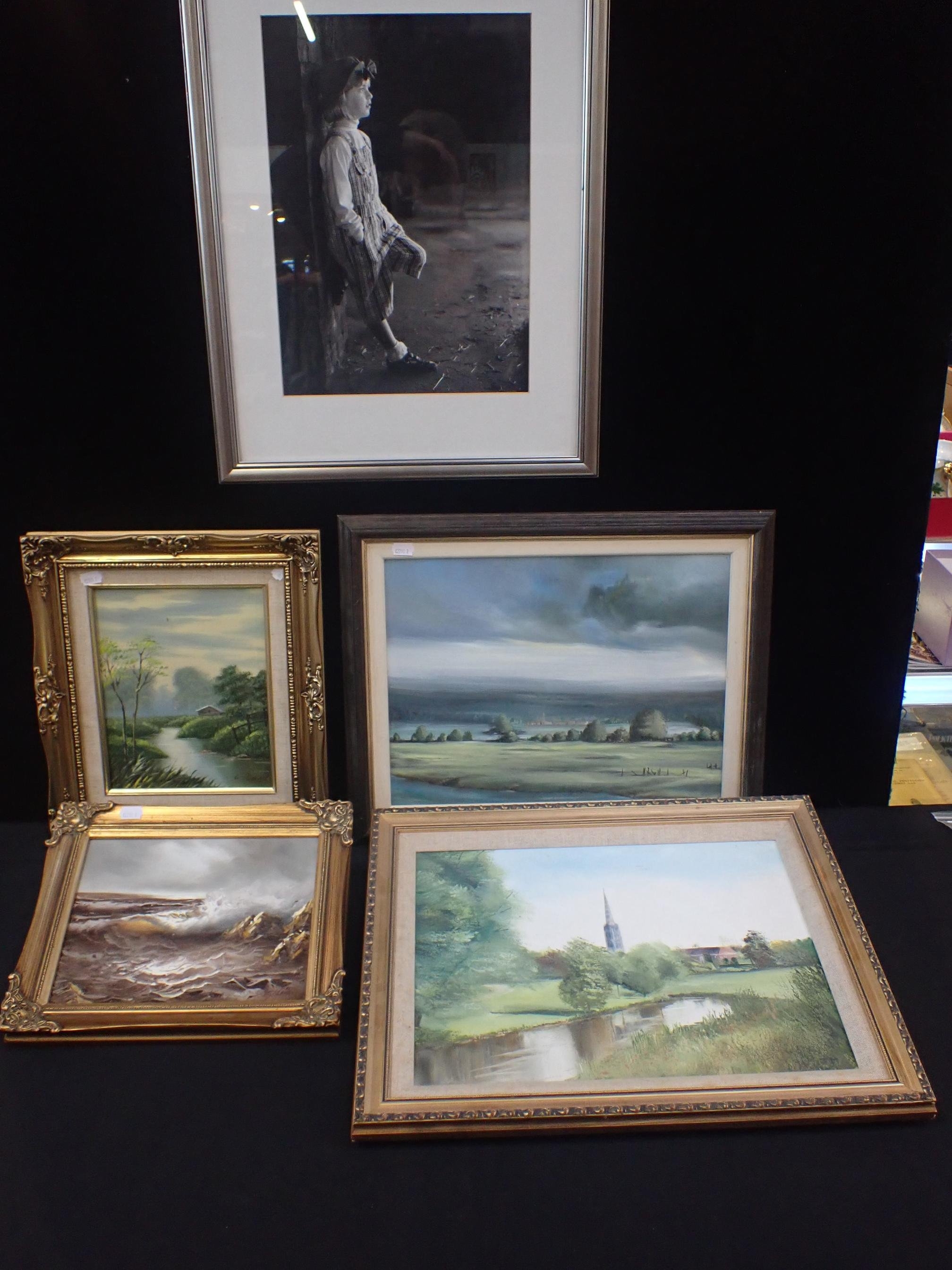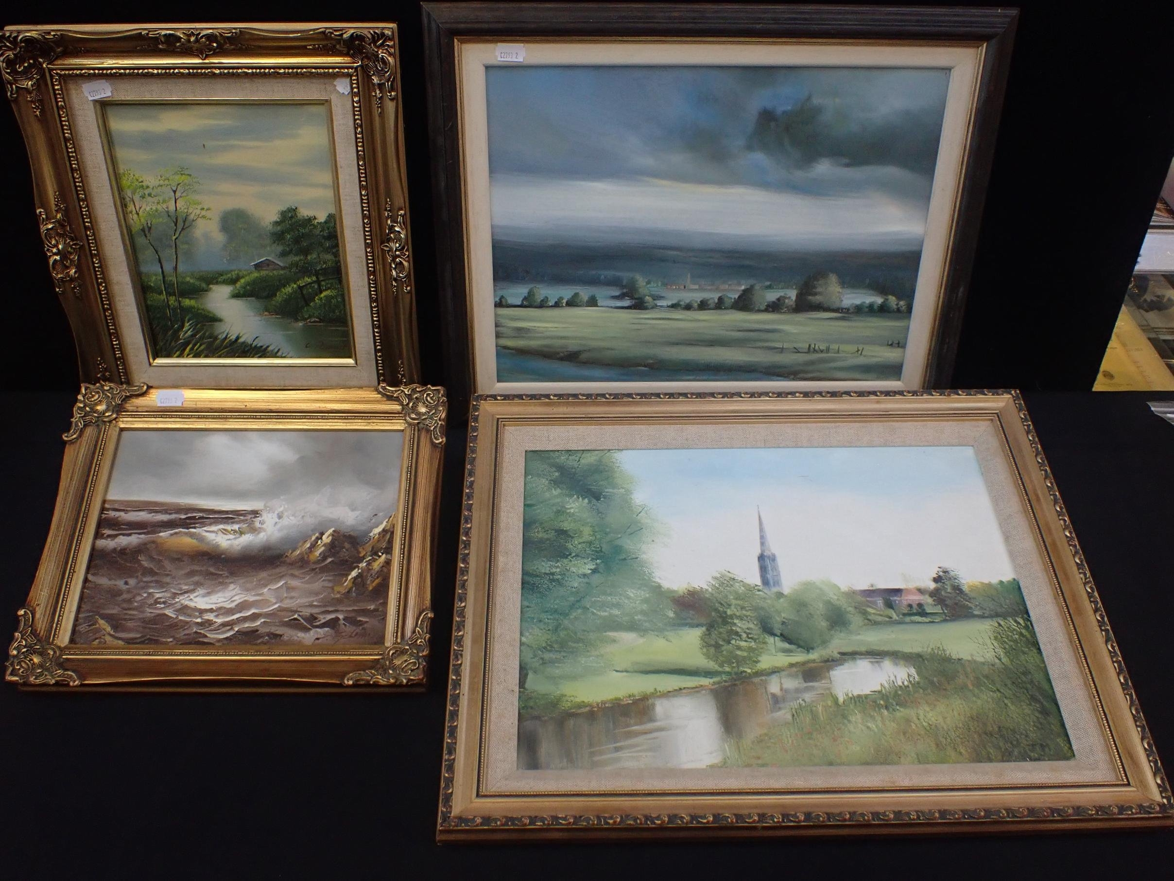 photograph, 1997, 42 cms wide, with a group of landscapes, oil on canvas, including Salisbury cathedral