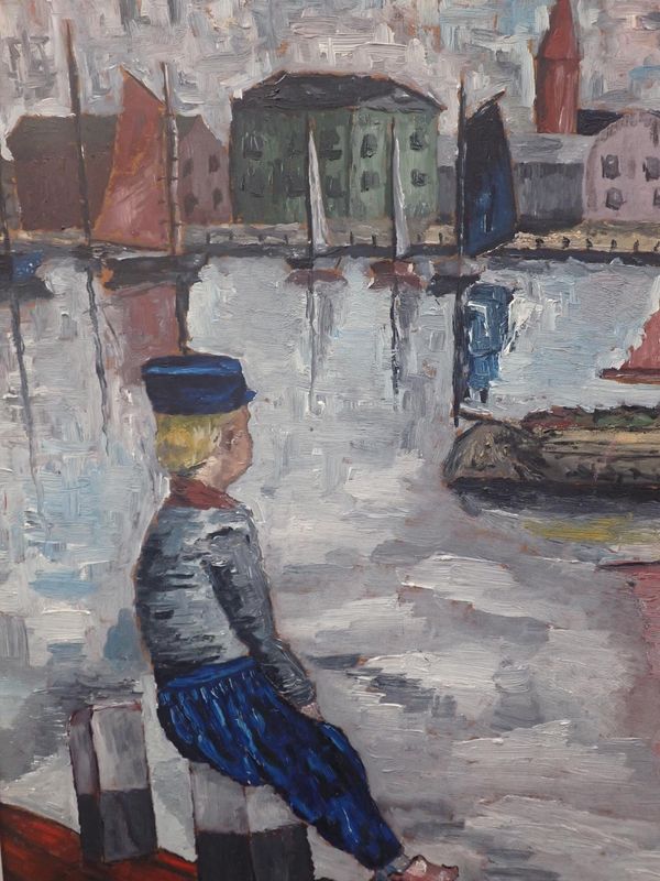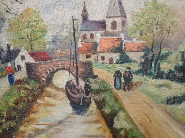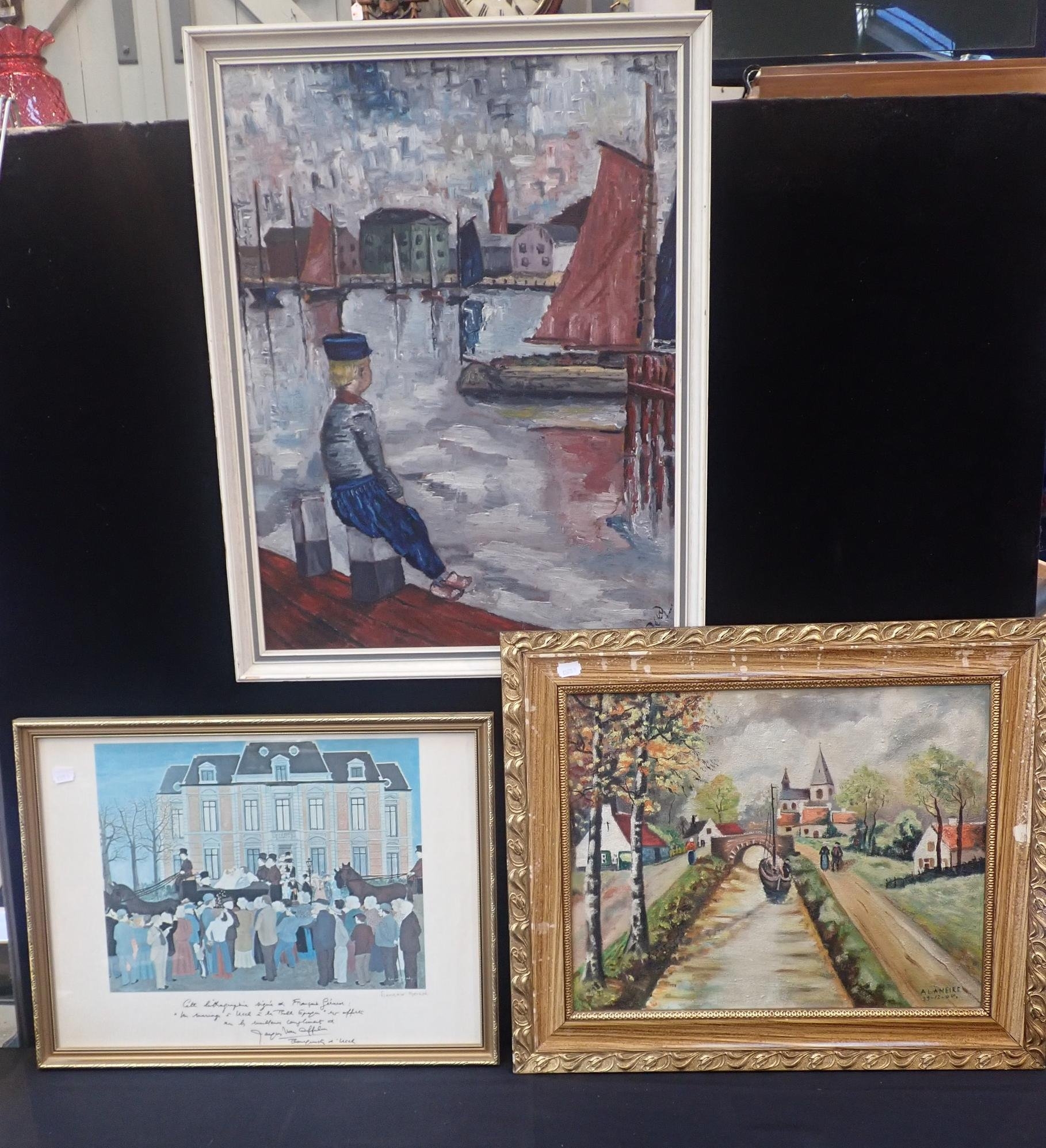 oil on canvas, dated 1944, with another oil on canvas of a Dutch harbour scene and a French lithograph signed Francois Gerard (3)