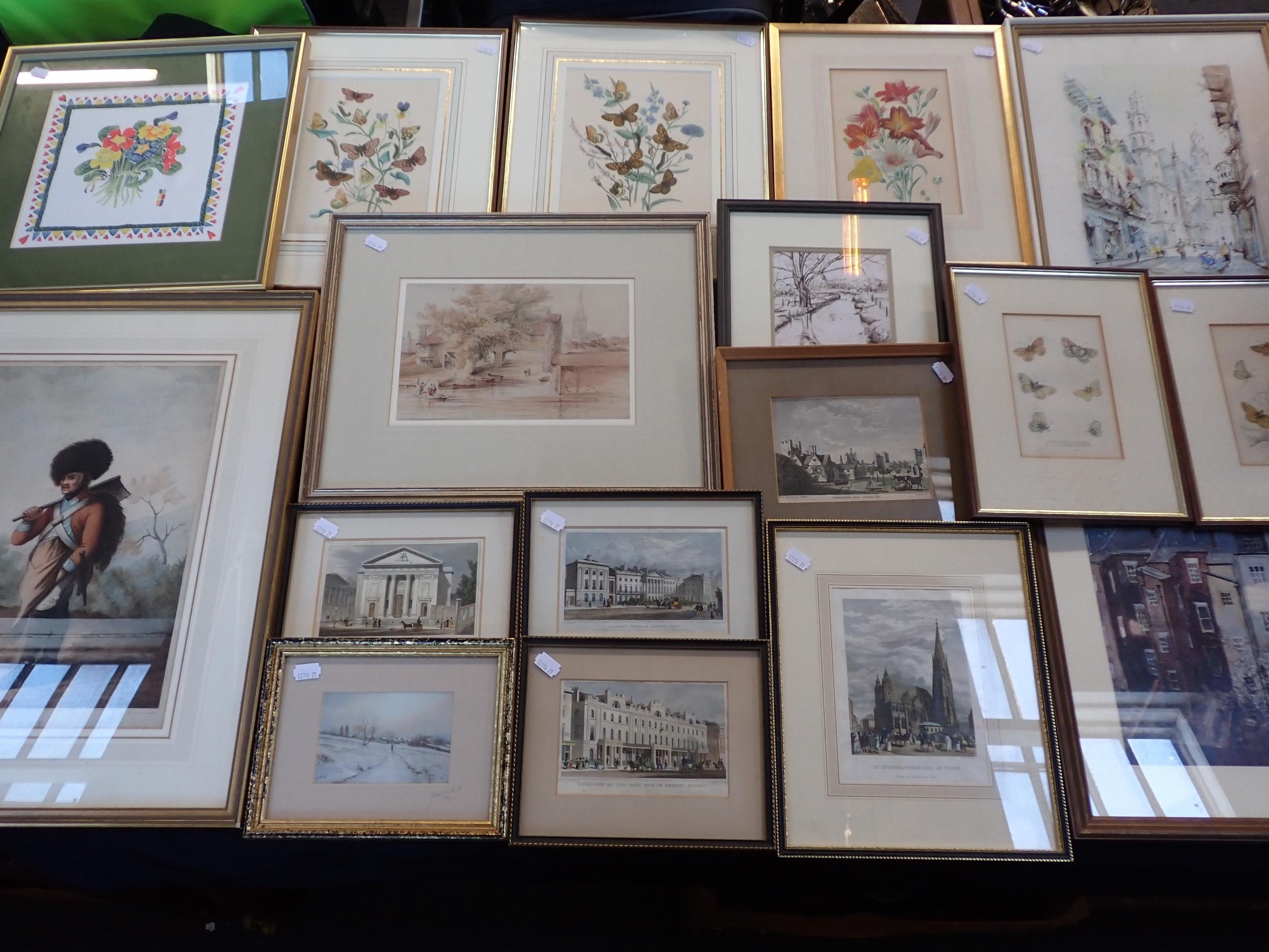 (Pull's ferry, Norwich, with the Cathedral in the distance), watercolour, framed, 34.5 x 42cm, and a further quantity of mixed pictures and prints (17)