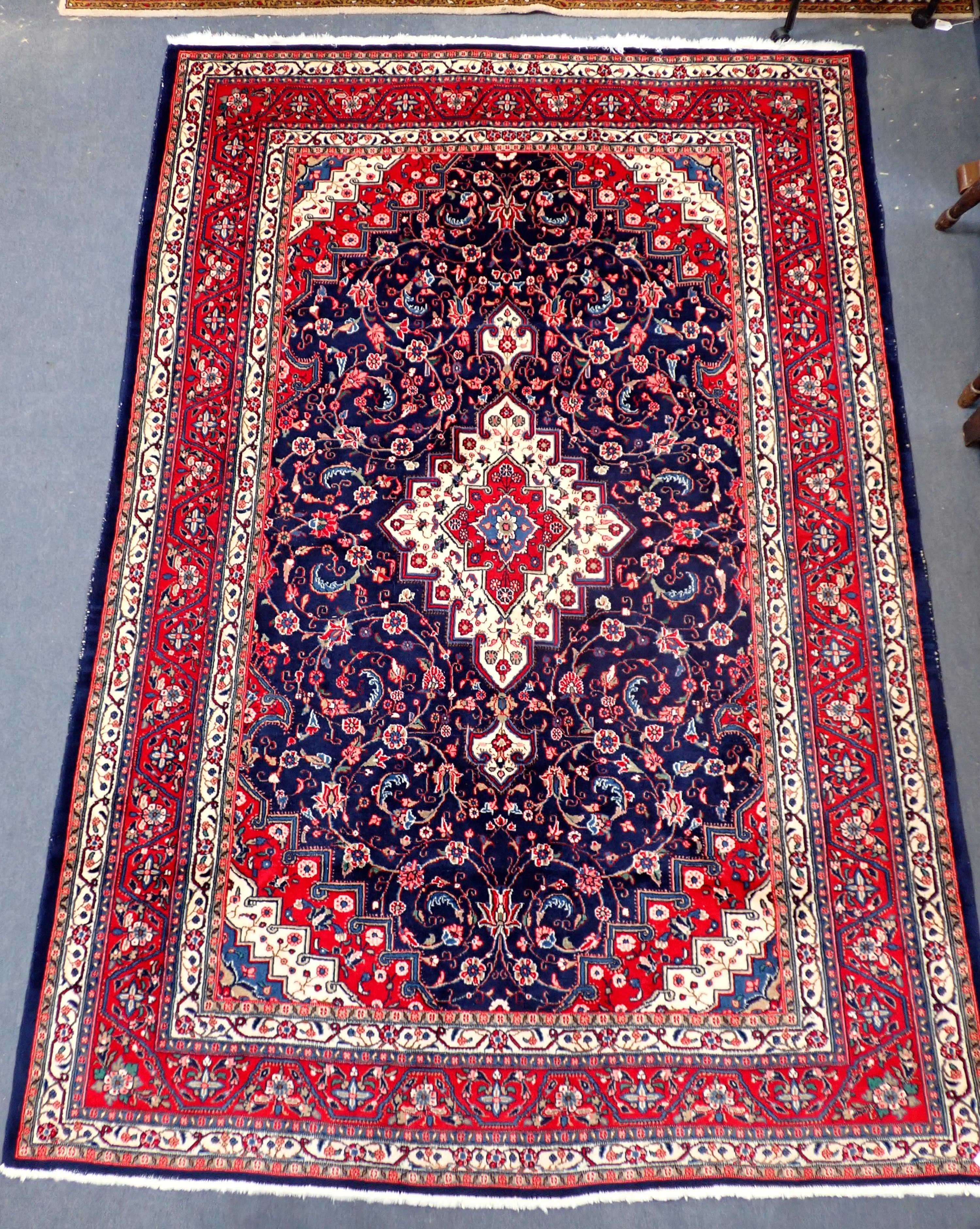 with red borders and central medallion, modern in traditional style, 203 x 302cm plus fringes