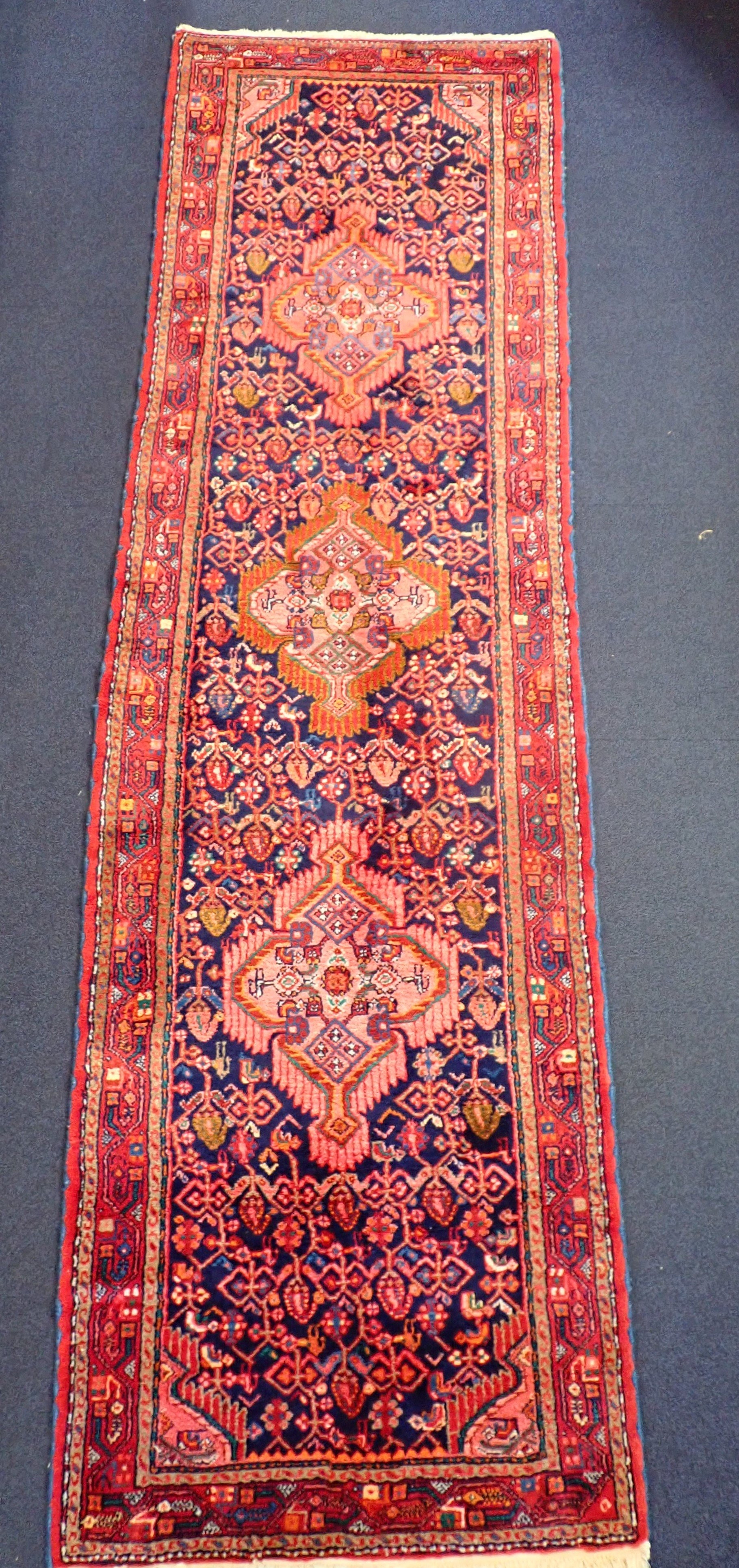 in traditional style, richly coloured, 90 x 312cm, plus fringes
