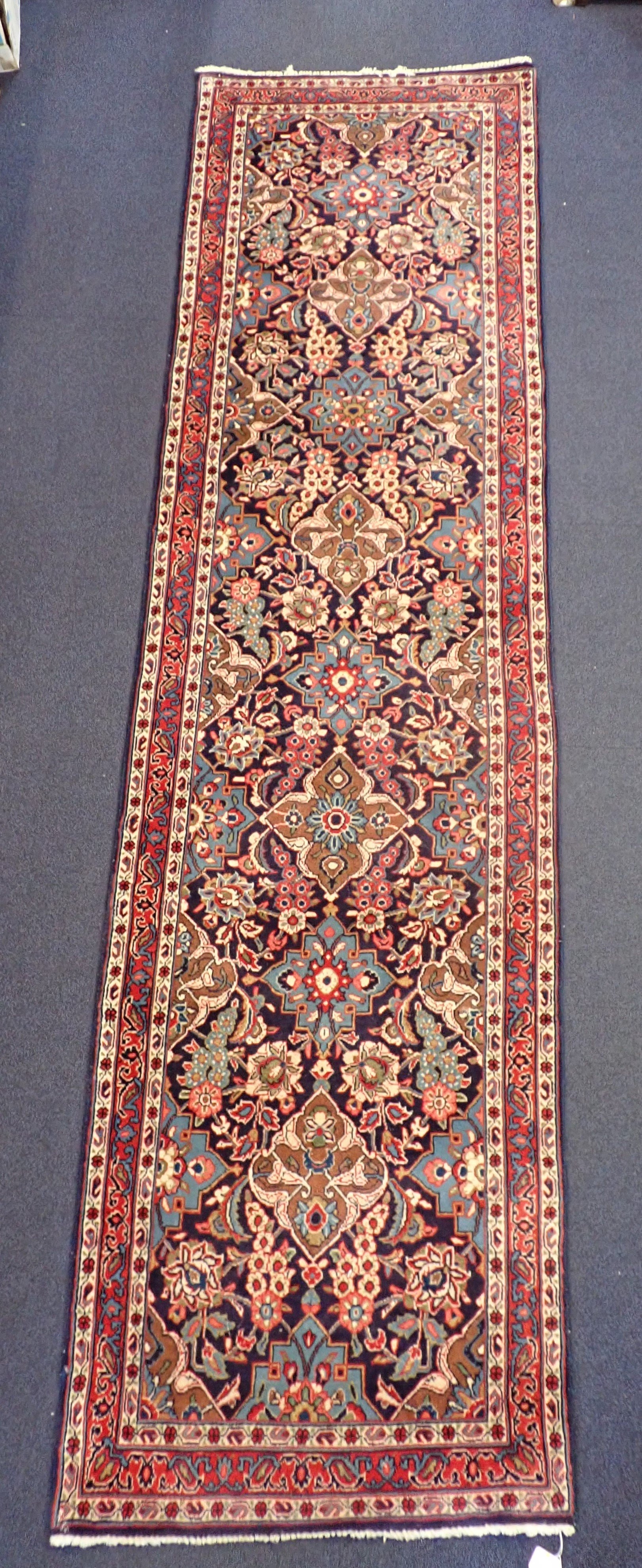 in traditional style, deep blues and reds, 82 x 311cm, plus fringes