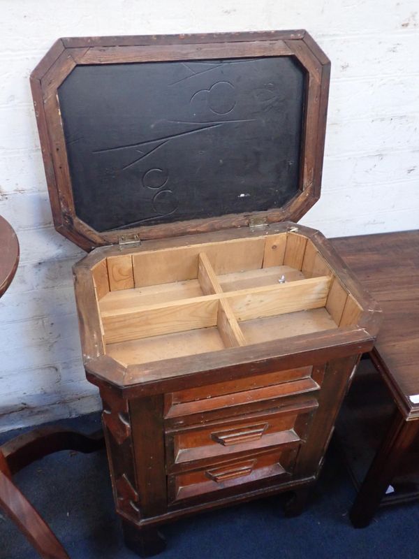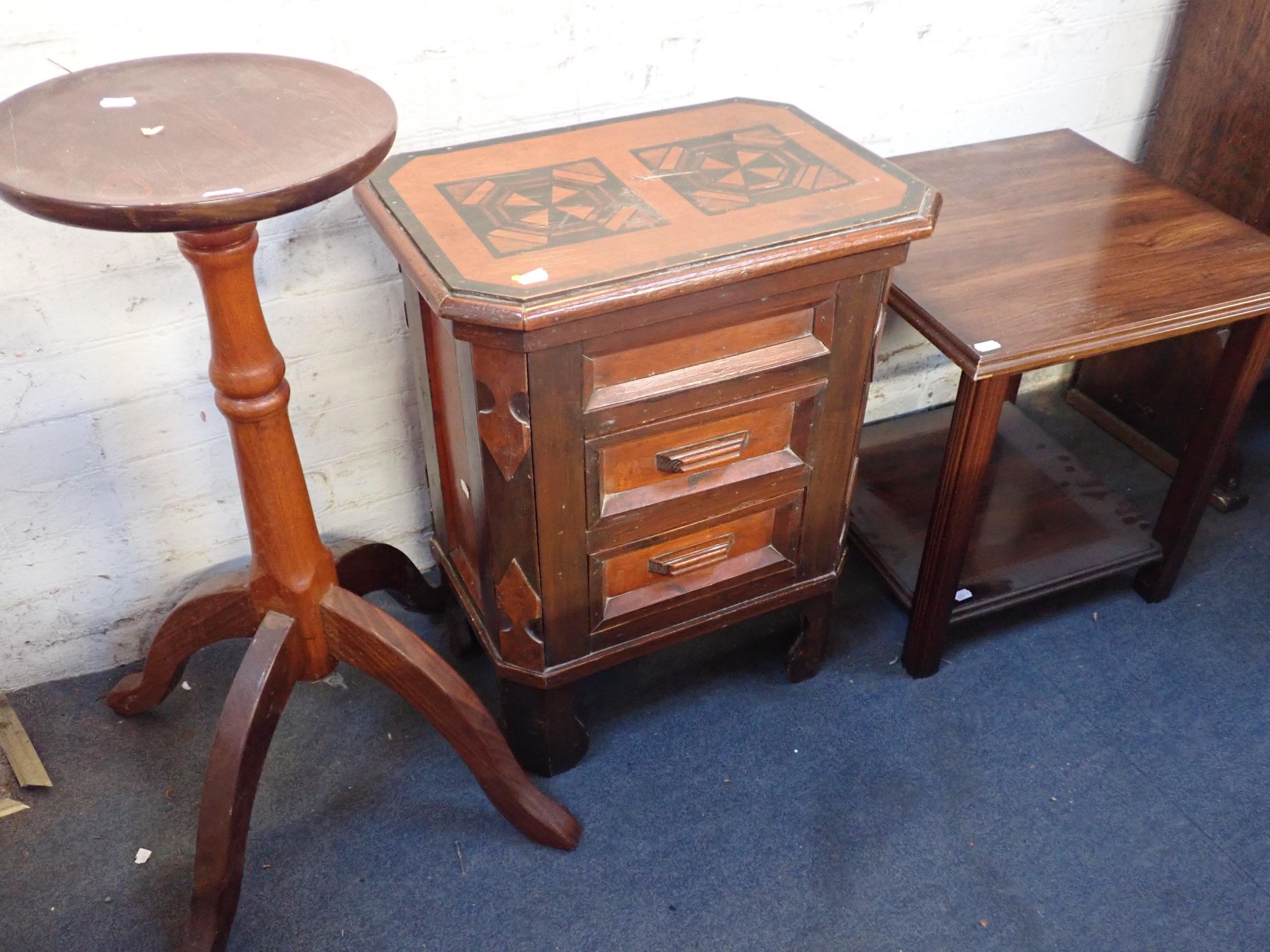 with stencilled faux parquetry top and two drawers, a square occasional table, and a plant stand (3)