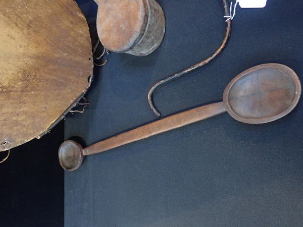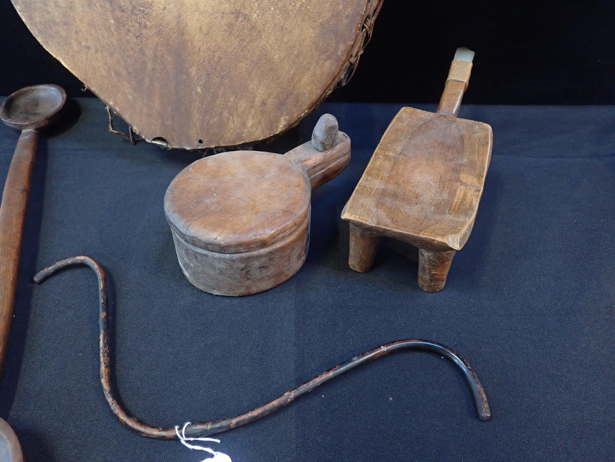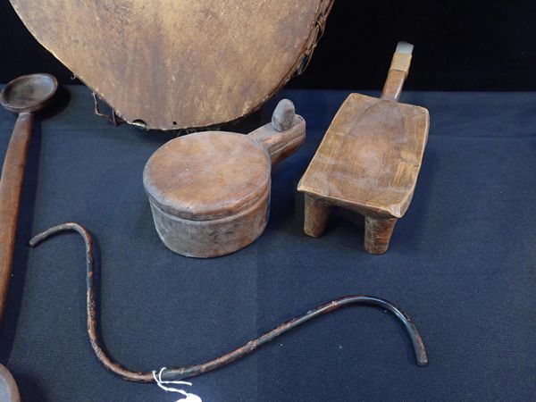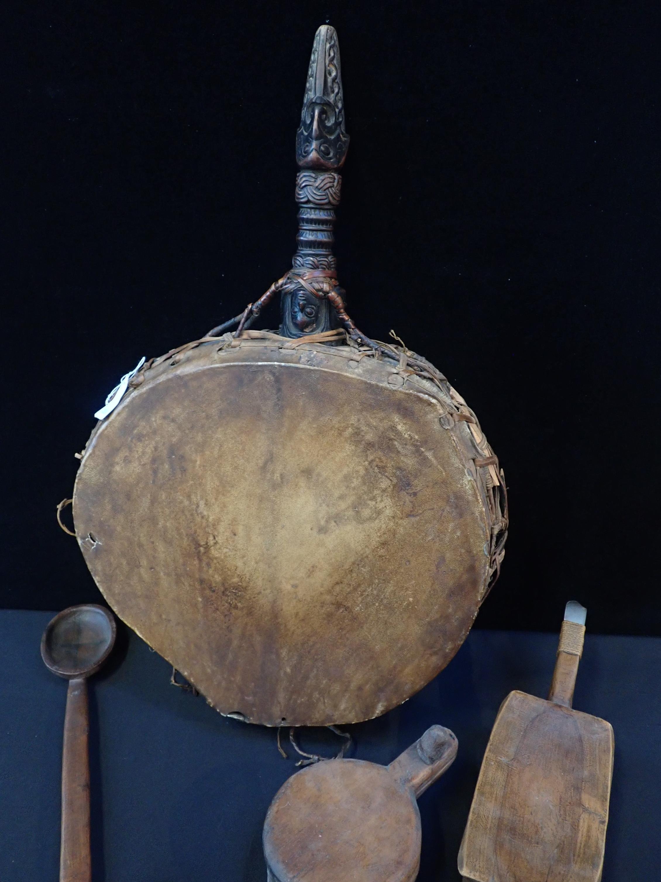 A TRIBAL DRUM WITH CARVED HANDLE