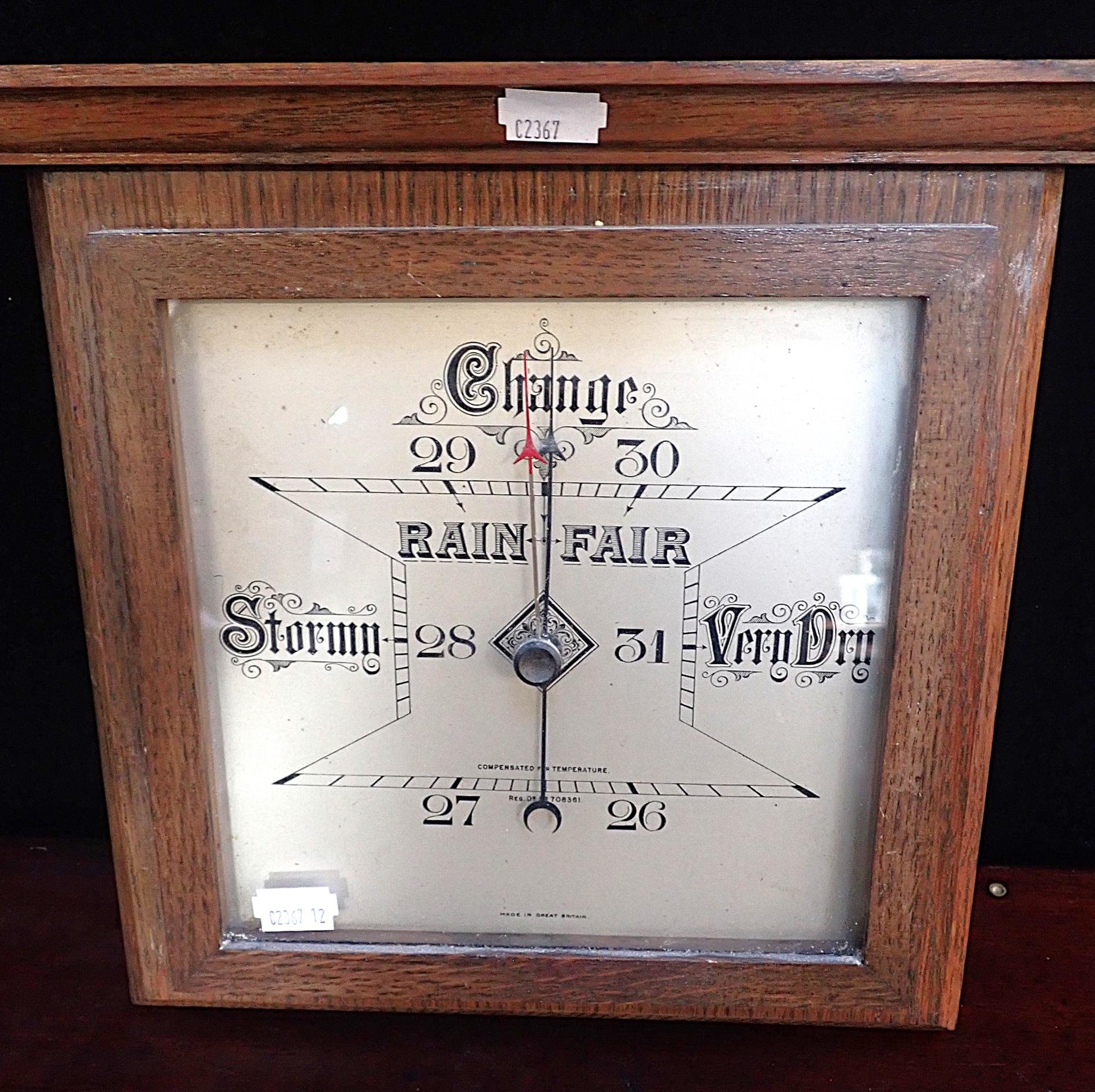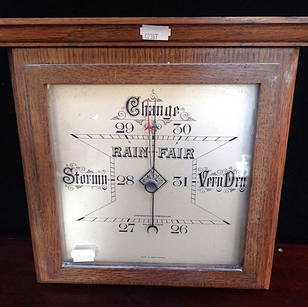 with fitted interior and brass lid stay, originally fitted with pegs for a book stand, 55cm wide (hinges replaced, later brass handles), with an oak cased aneroid barometer, a shooting stick, a 1930s date stamp, and a COSMOCORD Ltd MIC 33-1 microphone, by Acos (5)