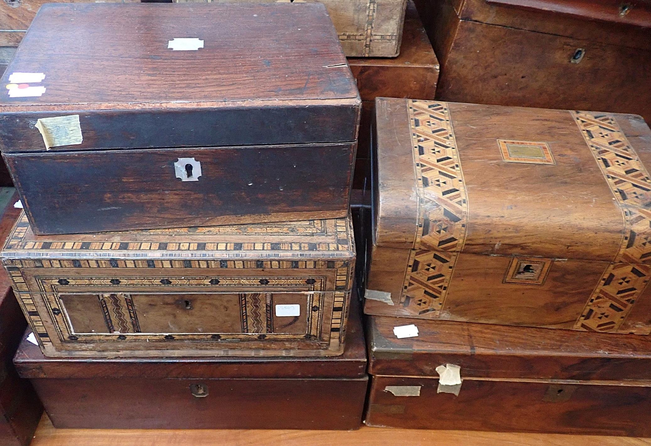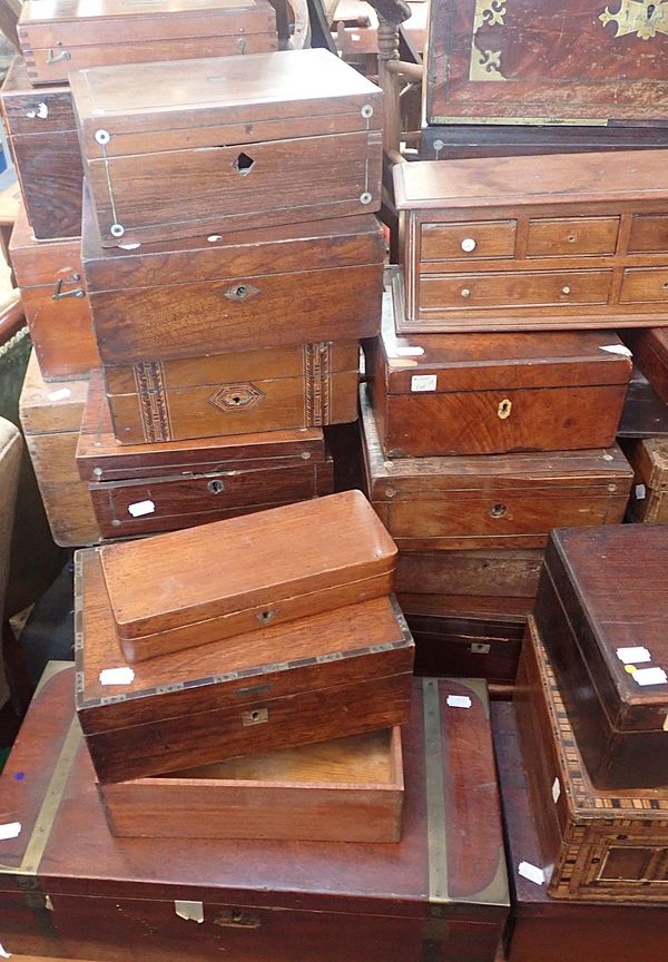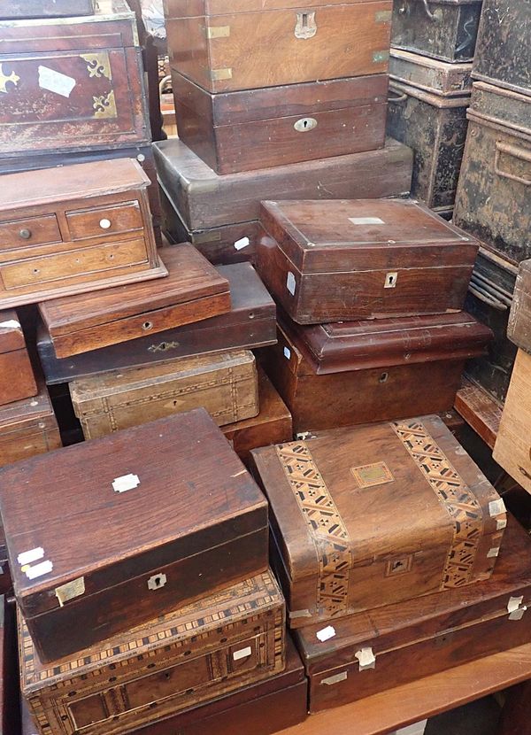 and other boxes, including a rosewood box with silk lining marked 'Tiffany & Co, New York', all for spares or restoration (approx 45, in poor condition)